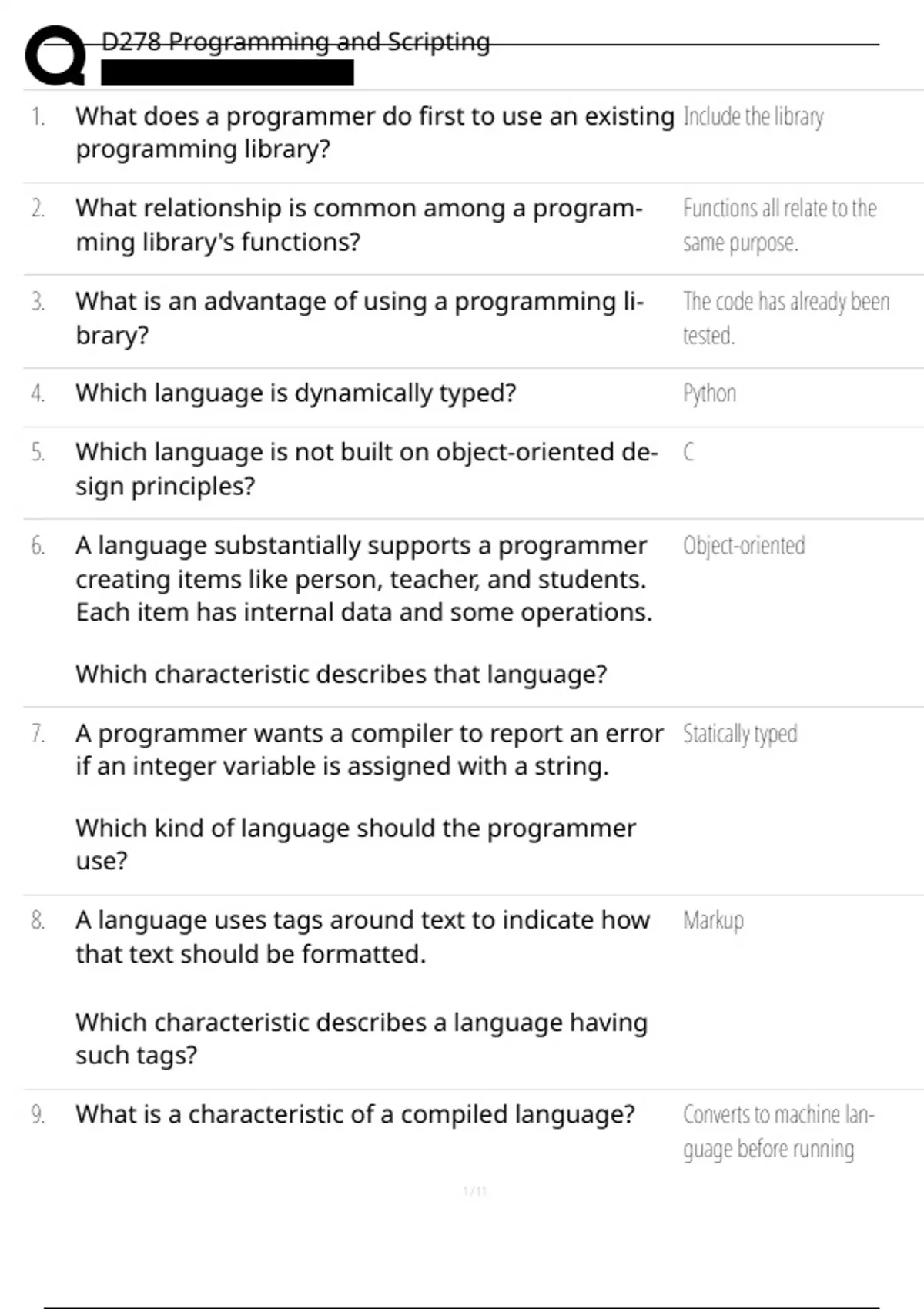 9. What is a characteristic of a compiled language? Converts to machine lan-