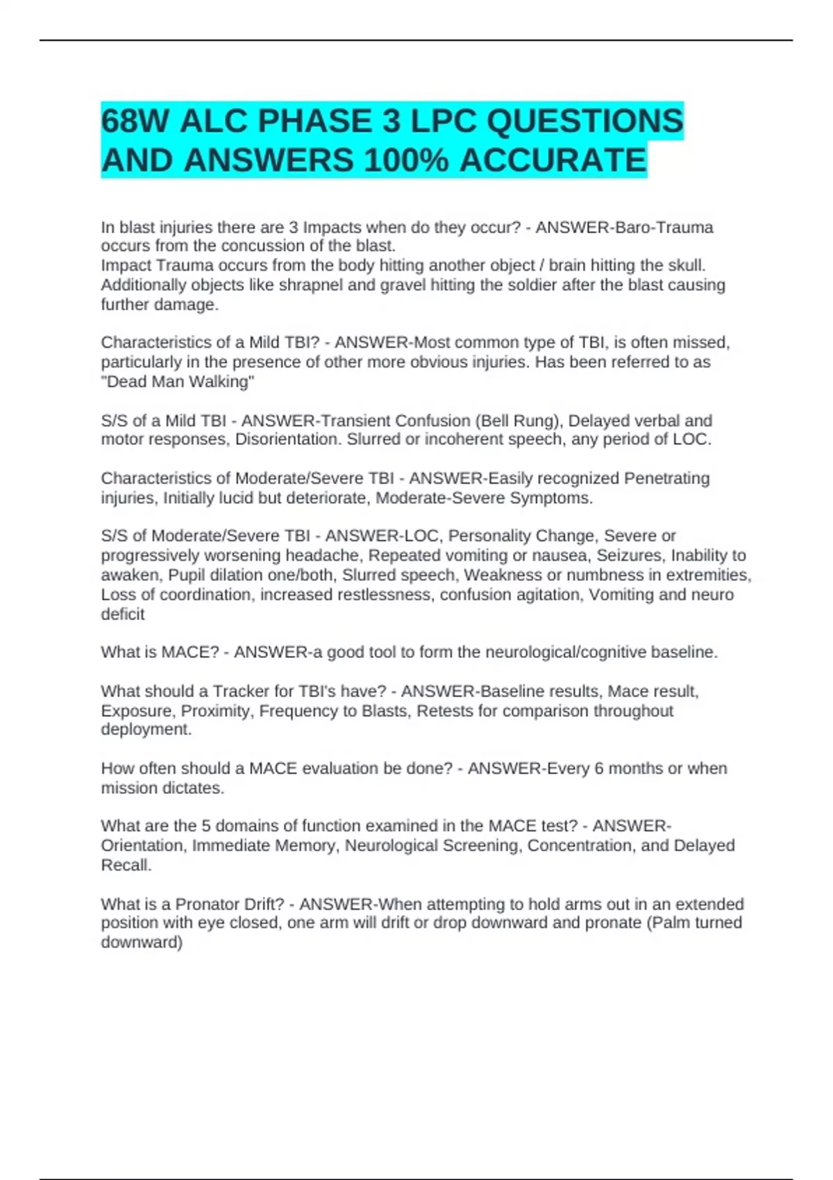 68W ALC PHASE 3 LPC QUESTIONS AND ANSWERS 100% ACCURATE68W ALC PHASE 3 LPC QUESTIONS AND ANSWERS 100% ACCURATE68W ALC PHASE 3 LPC QUESTIONS AND ANSWERS 100% ACCURATE In blast injuries there are 3 Impacts when do they occur? - ANSWER-Baro-Trauma occurs from the concussion of the blast. Impact Trauma occurs from the body hitting another object / brain hitting the skull. Additionally objects like shrapnel and gravel hitting the soldier after the blast causing further damage. Characteristics of a Mild TBI? - ANSWER-Most common type of TBI, is often missed, particularly in the presence of other more obvious injuries. Has been referred to as "Dead Man Walking" S/S of a Mild TBI - ANSWER-Transient Confusion (Bell Rung), Delayed verbal and motor responses, Disorientation. Slurred or incoherent speech, any period of LOC. Characteristics of Moderate/Severe TBI - ANSWER-Easily recognized Penetrating
