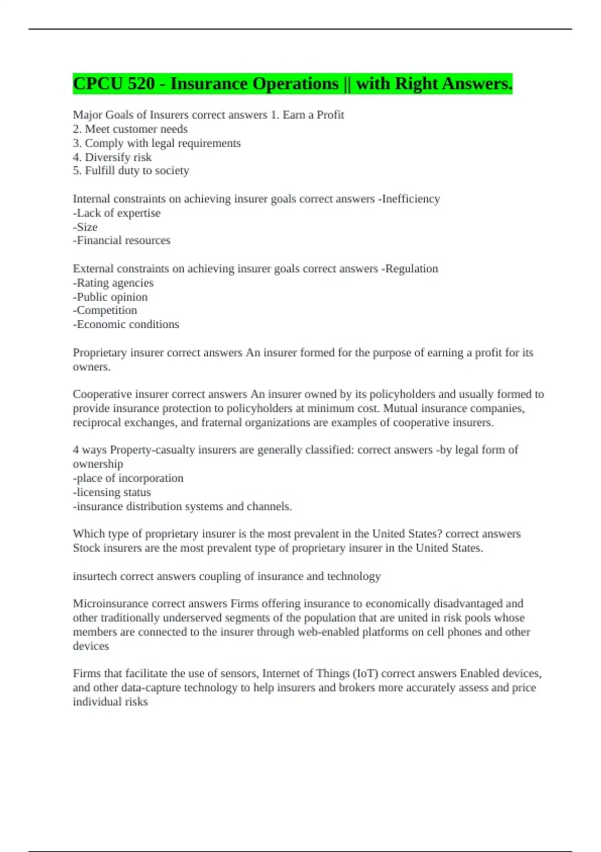 Major Goals of Insurers correct answers 1. Earn a Profit 2. Meet customer needs 3. Comply with legal requirements 4. Diversify risk 5. Fulfill duty to society Internal constraints on achieving insurer goals correct answers -Inefficiency -Lack of expertise -Size -Financial resources External constraints on achieving insurer goals correct answers -Regulation -Rating agencies -Public opinion -Competition -Economic conditions Proprietary insurer correct answers An insurer formed for the purpose of earning a profit for its owners. Cooperative insurer correct answers An insurer owned by its policyholders and usually formed to provide insurance protection to policyholders at minimum cost. Mutual insurance companies, reciprocal exchanges, and fraternal organizations are examples of cooperative insurers. 4 ways Property-casualty insurers are generally classified: correct answers -by legal form of ownership -place of incorporation -licensing status -insurance distribution systems and channels. Which type of proprietary insurer is the most prevalent in the United States? correct answers Stock insurers are the most prevalent type of proprietary insurer in the United States. insurtech correct answers coupling of insurance and technology Microinsurance correct answers Firms offering insurance to economically disadvantaged and other traditionally underserved segments of the population that are united in risk pools whose members are connected to the insurer through web-enabled platforms on cell phones and other devices Firms that facilitate the use of sensors, Internet of Things (IoT) correct answers Enabled devices, and other data-capture technology to help insurers and brokers more accurately assess and price
