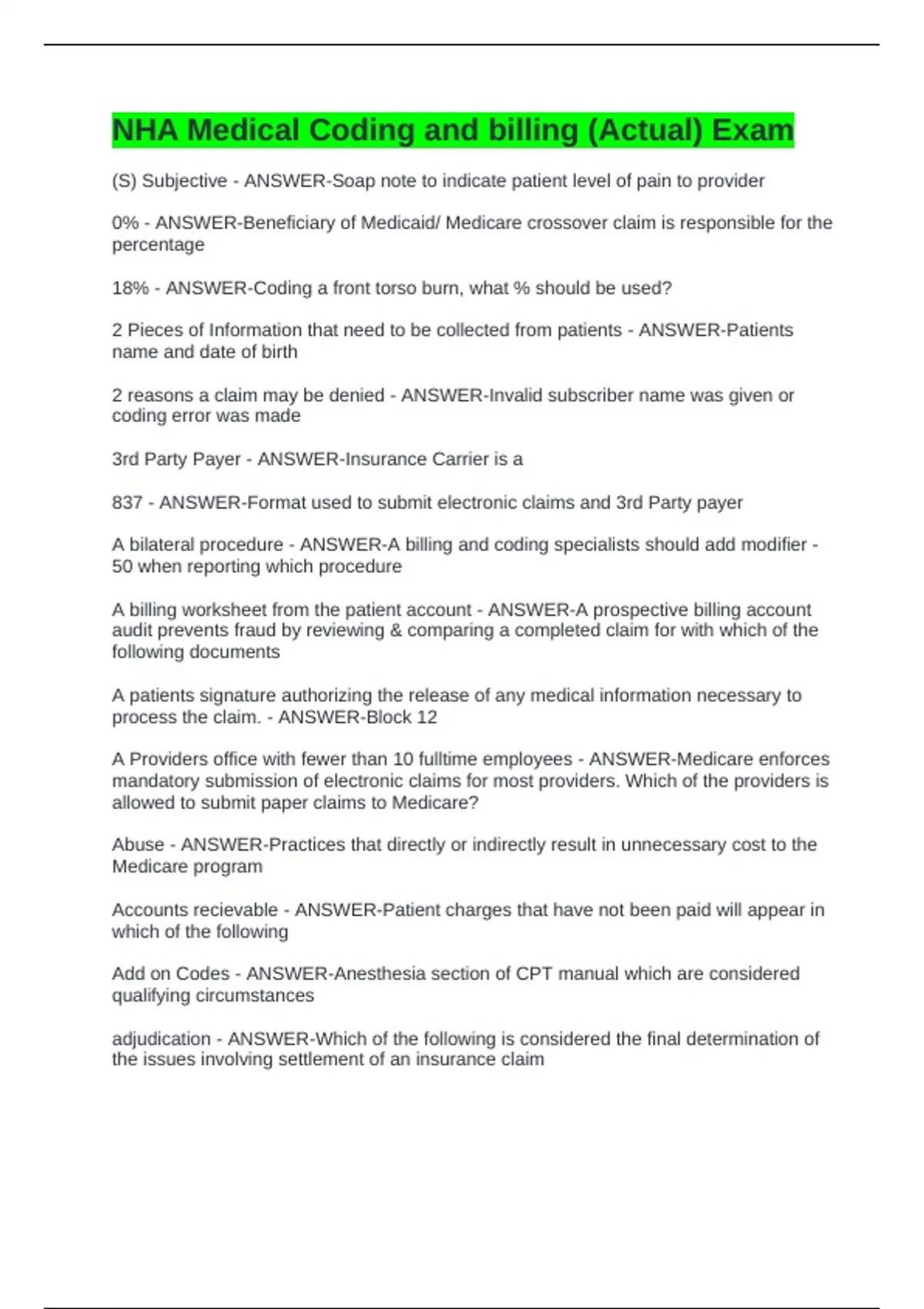 NHA Medical Coding and billing (Actual) Exam