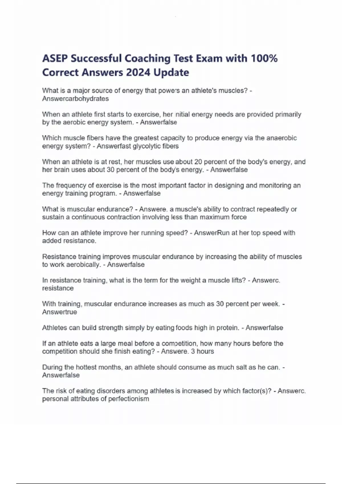 ASEP Successful Coaching Test Exam with 100% Correct Answers 2024 Update What is a major source of energy that powers an athlete's muscles? - Answercarbohydrates When an athlete first starts to exercise, her initial energy needs are provided primarily by the aerobic energy system. - Answerfalse Which muscle fibers have the greatest capacity to produce energy via the anaerobic energy system? - Answerfast glycolytic fibers When an athlete is at rest, her muscles use about 20 percent of the body's energy, and her brain uses about 30 percent of the body's energy. - Answerfalse The frequency of exercise is the most important factor in designing and monitoring an energy training program. - Answerfalse What is muscular endurance? - Answere. a muscle's ability to contract repeatedly or sustain a continuous contraction involving less than maximum force How can an athlete improve her running speed? - AnswerRun at her top speed with added resistance. Resistance training improves muscular endurance by increasing the ability of muscles to work aerobically. - Answerfalse In resistance training, what is the term for the weight a muscle lifts? - Answerc. resistance With training, muscular endurance increases as much as 30 percent per week. - Answertrue Athletes can build strength simply by eating foods high in protein. - Answerfalse If an athlete eats a large meal before a competition, how many hours before the competition should she finish eating? - Answere. 3 hours During the hottest months, an athlete should consume as much salt as he can. - Answerfalse The risk of eating disorders among athletes is increased by which factor(s)? - Answerc. personal attributes of perfectionism A healthy diet includes 10 to 15 percent fat. - Answerfalse Athletes should limit the amount of weight they try to lose to two or fewer pounds per week. - Answertrue