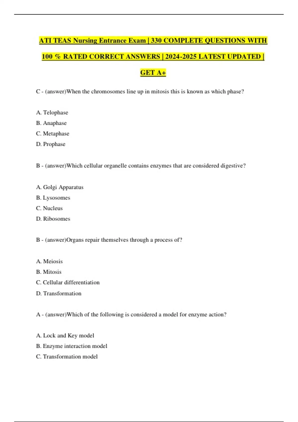 C - (answer)When the chromosomes line up in mitosis this is known as which phase?