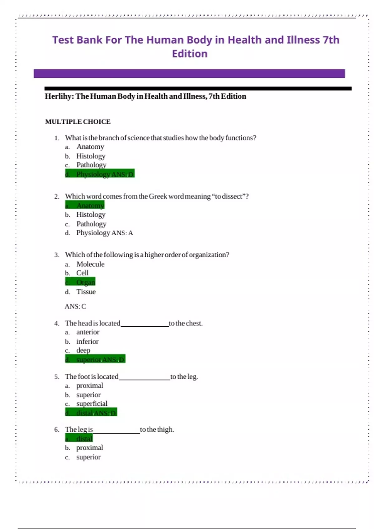 Test Bank For The Human Body in Health and Illness 7th Edition