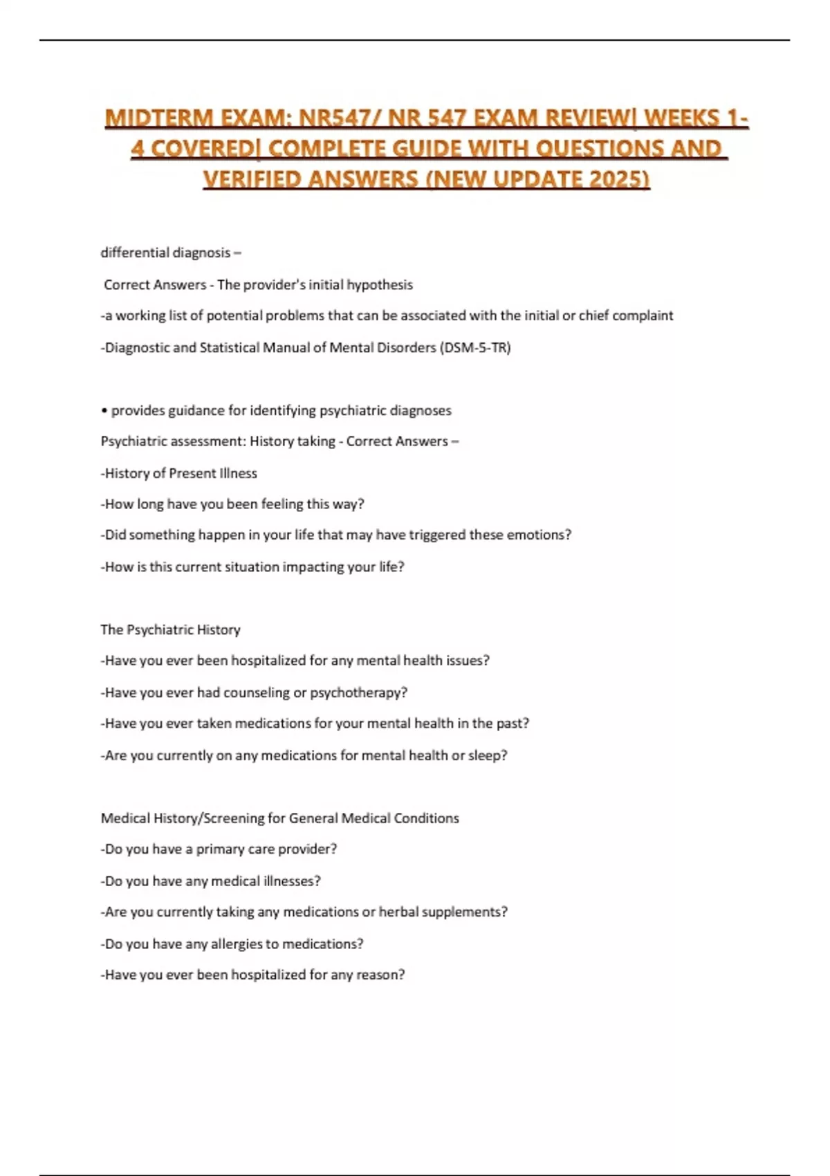 MIDTERM EXAM: NR547/ NR 547 EXAM REVIEW| WEEKS 1-4 COVERED| COMPLETE GUIDE WITH QUESTIONS AND VERIFIED ANSWERS (NEW UPDATE 2025) differential diagnosis – Correct Answers - The provider's initial hypothesis -a working list of potential problems that can be associated with the initial or chief complaint -Diagnostic and Statistical Manual of Mental Disorders (DSM-5-TR) • provides guidance for identifying psychiatric diagnoses Psychiatric assessment: History taking - Correct Answers – -History of Present Illness -How long have you been feeling this way? -Did something happen in your life that may have triggered these emotions? -How is this current situation impacting your life? The Psychiatric History -Have you ever been hospitalized for any mental health issues? -Have you ever had counseling or psychotherapy? -Have you ever taken medications for your mental health in the past? -Are you currently on any medications for mental health or sleep? Medical History/Screening for General Medical Conditions -Do you have a primary care provider? -Do you have any medical illnesses? -Are you currently taking any medications or herbal supplements? -Do you have any allergies to medications? -Have you ever been hospitalized for any reason?