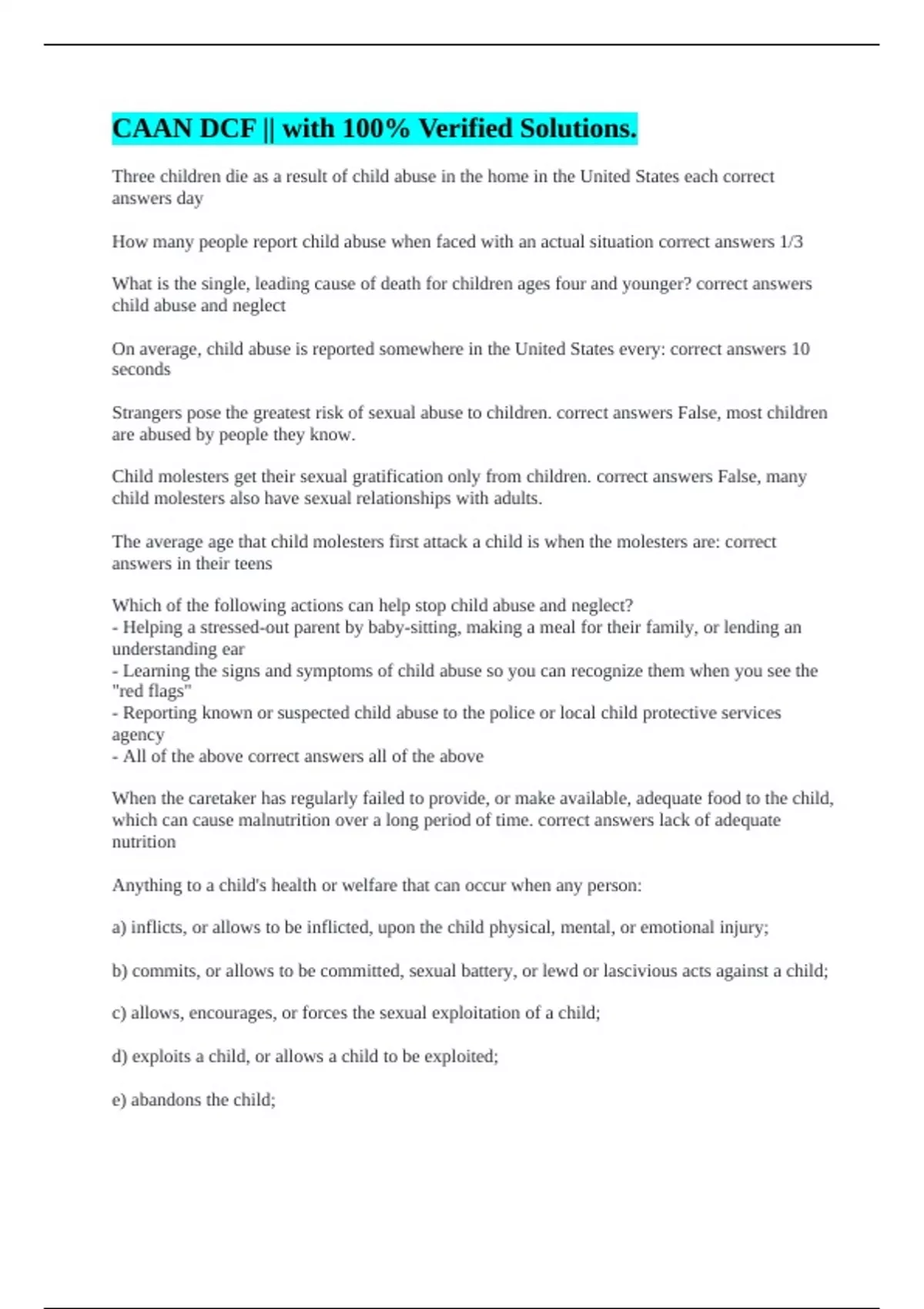 Three children die as a result of child abuse in the home in the United States each correct answers day How many people report child abuse when faced with an actual situation correct answers 1/3 What is the single, leading cause of death for children ages four and younger? correct answers child abuse and neglect On average, child abuse is reported somewhere in the United States every: correct answers 10 seconds Strangers pose the greatest risk of sexual abuse to children. correct answers False, most children are abused by people they know. Child molesters get their sexual gratification only from children. correct answers False, many child molesters also have sexual relationships with adults. The average age that child molesters first attack a child is when the molesters are: correct answers in their teens Which of the following actions can help stop child abuse and neglect? - Helping a stressed-out parent by baby-sitting, making a meal for their family, or lending an understanding ear - Learning the signs and symptoms of child abuse so you can recognize them when you see the "red flags" - Reporting known or suspected child abuse to the police or local child protective services agency - All of the above correct answers all of the above When the caretaker has regularly failed to provide, or make available, adequate food to the child, which can cause malnutrition over a long period of time. correct answers lack of adequate nutrition Anything to a child's health or welfare that can occur when any person: a) inflicts, or allows to be inflicted, upon the child physical, mental, or emotional injury; b) commits, or allows to be committed, sexual battery, or lewd or lascivious acts against a child; c) allows, encourages, or forces the sexual exploitation of a child; d) exploits a child, or allows a child to be exploited; e) abandons the child;
