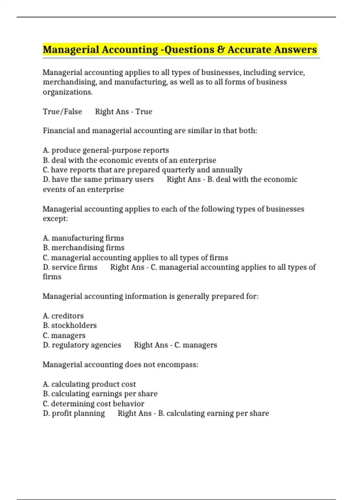 Managerial Accounting -Questions & Accurate Answers