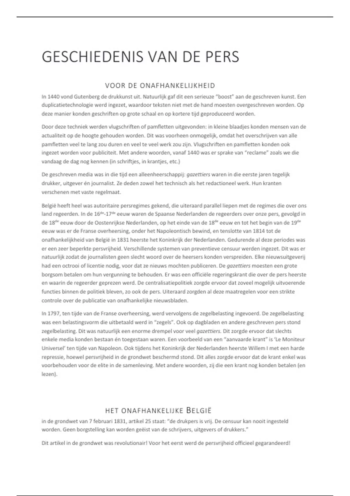Dit document is de samenvatting van het hoofdstuk "geschiedenis van de pers" van het vak "inleiding tot de journalistiek" dat in de richting Toegepaste Taalkunde en in het schakelprogramma journalistiek aan de VUB gegeven wordt. Deze samenvatting legt het hoofdstuk zo goed mogelijk uit en is zeer handig voor als je de lessen hebt gemist of als ondersteuning bij het examen. Je mag me altijd een berichtje sturen als je vragen of opmerkingen hebt! Veel succes :)