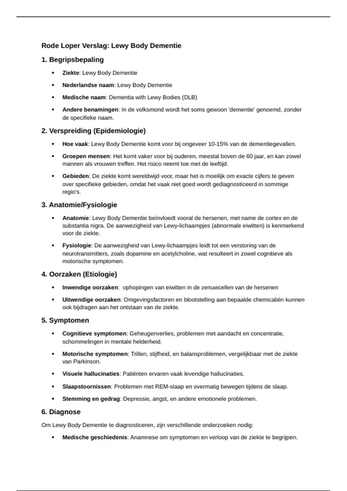 Dit is een rode loper over Lewy Body dementie, dit heeft mij heel erg geholpen met mijn stage, je komt veel te weten en onthoud het beter. Erg fijn om in de praktijk toe te kunnen passen