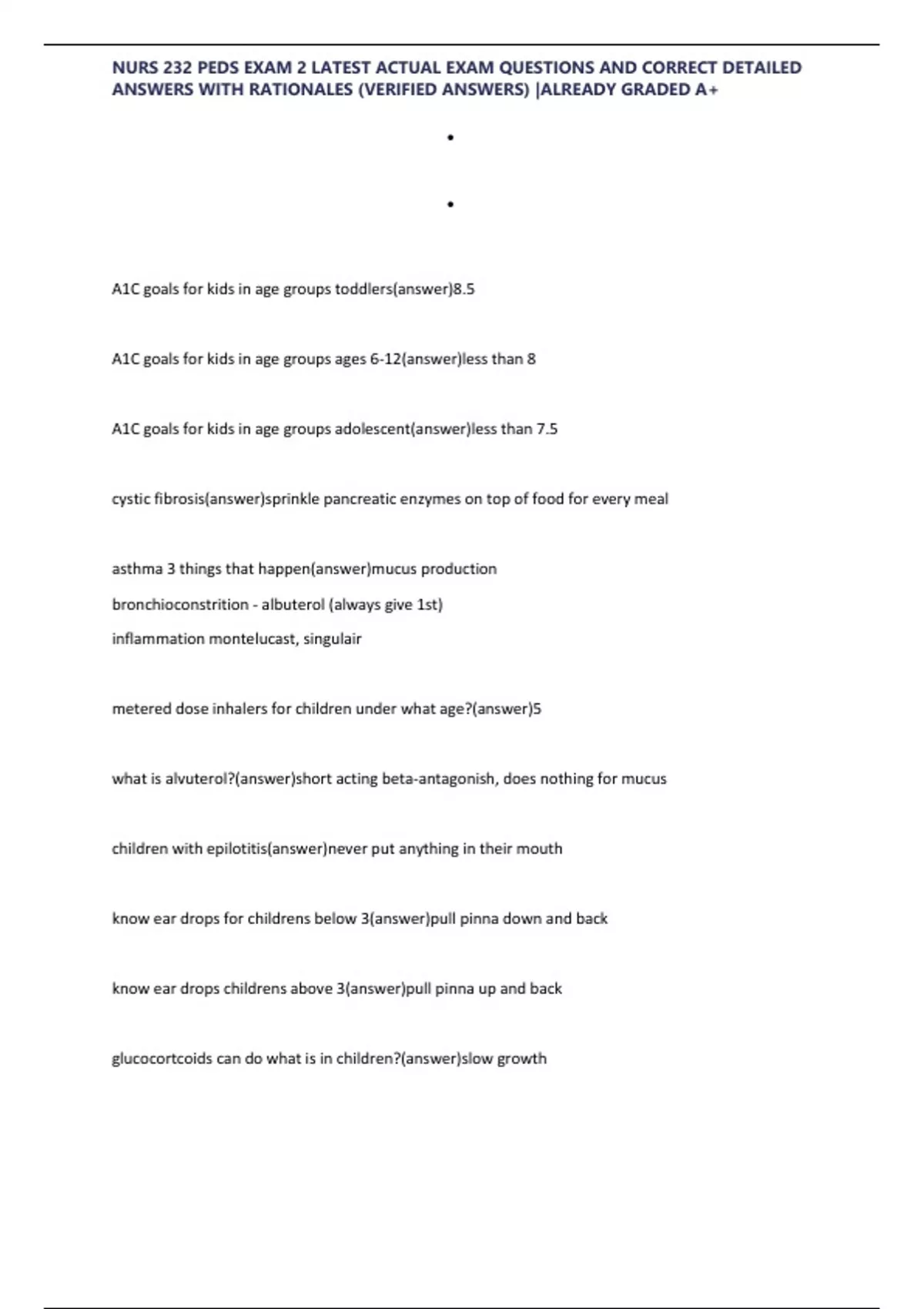 NURS 232 PEDS EXAM 2 LATEST ACTUAL EXAM QUESTIONS AND CORRECT DETAILED
