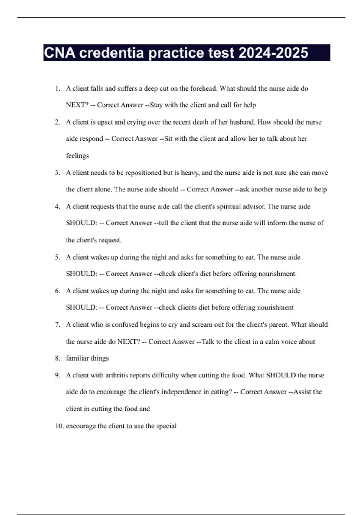 1. A client falls and suffers a deep cut on the forehead. What should the nurse aide do NEXT? -- Correct Answer --Stay with the client and call for help 2. A client is upset and crying over the recent death of her husband. How should the nurse aide respond -- Correct Answer --Sit with the client and allow her to talk about her feelings
