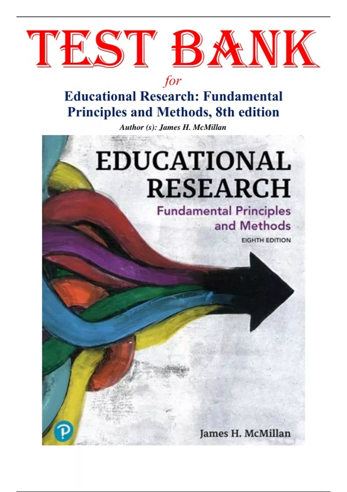 Test Bank for Educational Research: Fundamental Principles and Methods 8e 8th Edition by James H McMillan ISBN-13: 0092 Part I: Getting Ready for Research 1. Introduction to Research in Education 2. Ethical Issues, Principles, and Practices 3. Research Problems and Questions 4. Locating and Reviewing Related Literature Part II: Quantitative Research 5. Participants and Sampling for Quantitative Designs 6. Foundations of Educational Measurement 7. Quantitative Data Collection Techniques 8. Nonexperimental Quantitative Research Designs 9. Experimental Research Designs 10. Understanding Statistical Inferences Part III: Qualitative Research 11. Qualitative Research Designs 12. Qualitative Data Collection 13. Qualitative Data Analysis, Validity/Trustworthiness, and Reporting Part IV: Mixed Methods and Action Research 14. Mixed Methods Designs 15. Action Research Part V: Communicating Research Results 16. Writing Research Proposals, Reports, and Articles