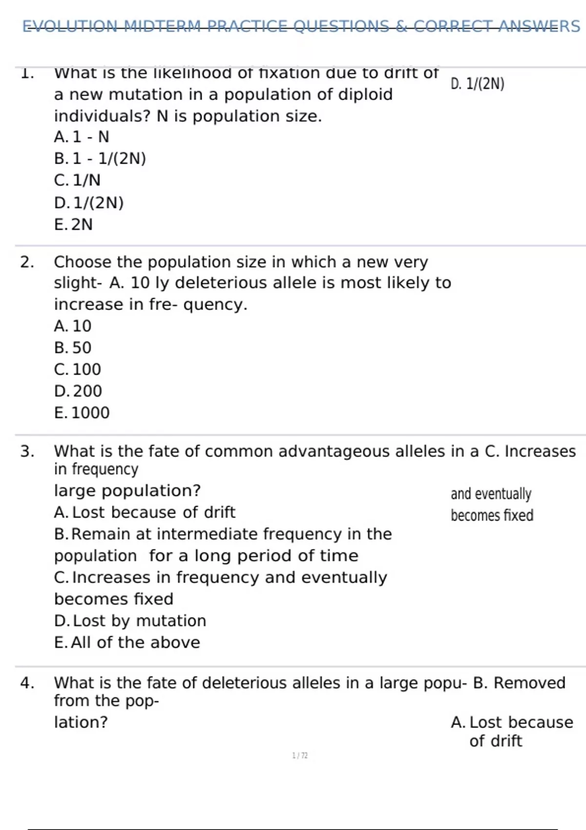 4. What is the fate of deleterious alleles in a large popu- B. Removed