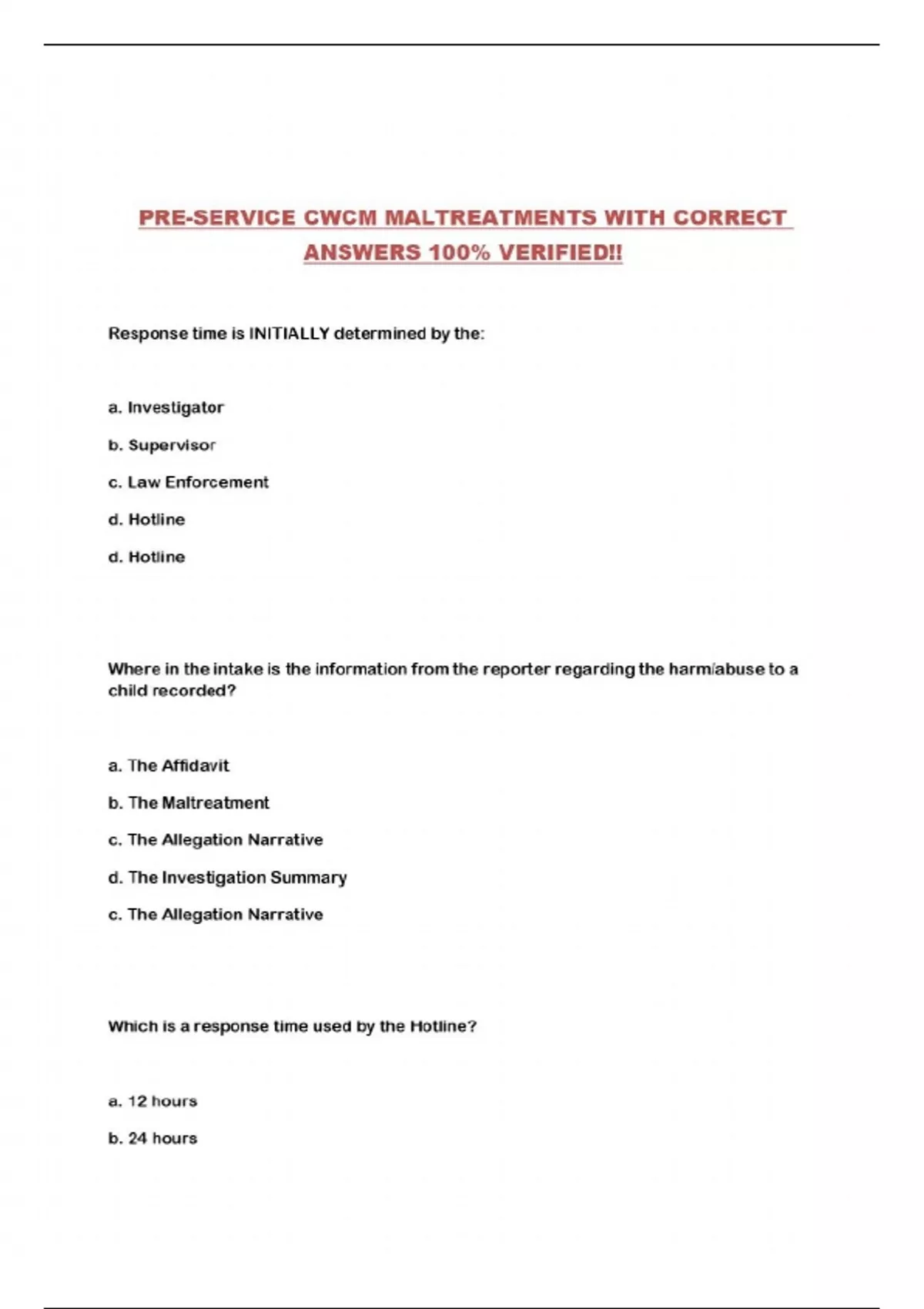 PRE-SERVICE CWCM MALTREATMENTS WITH CORRECT ANSWERS 100% VERIFIED!!...