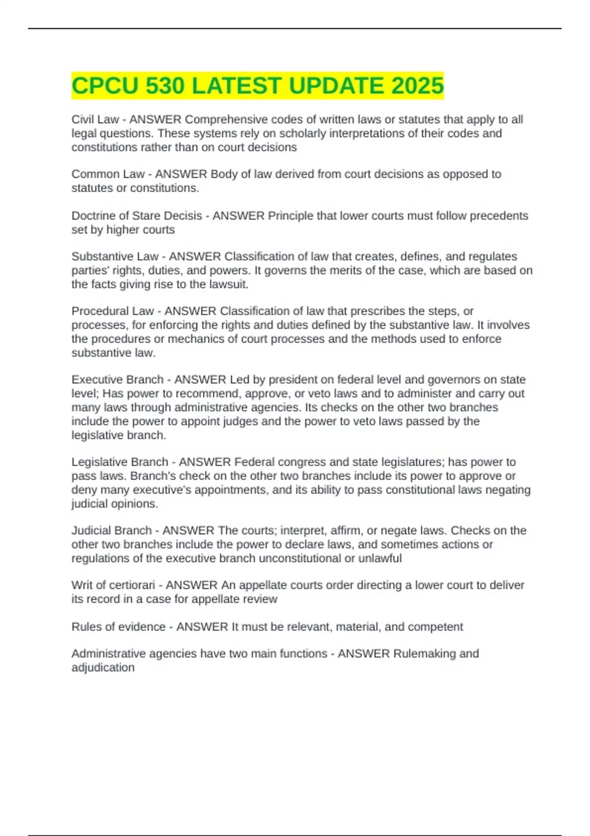 Common Law - ANSWER Body of law derived from court decisions as opposed to