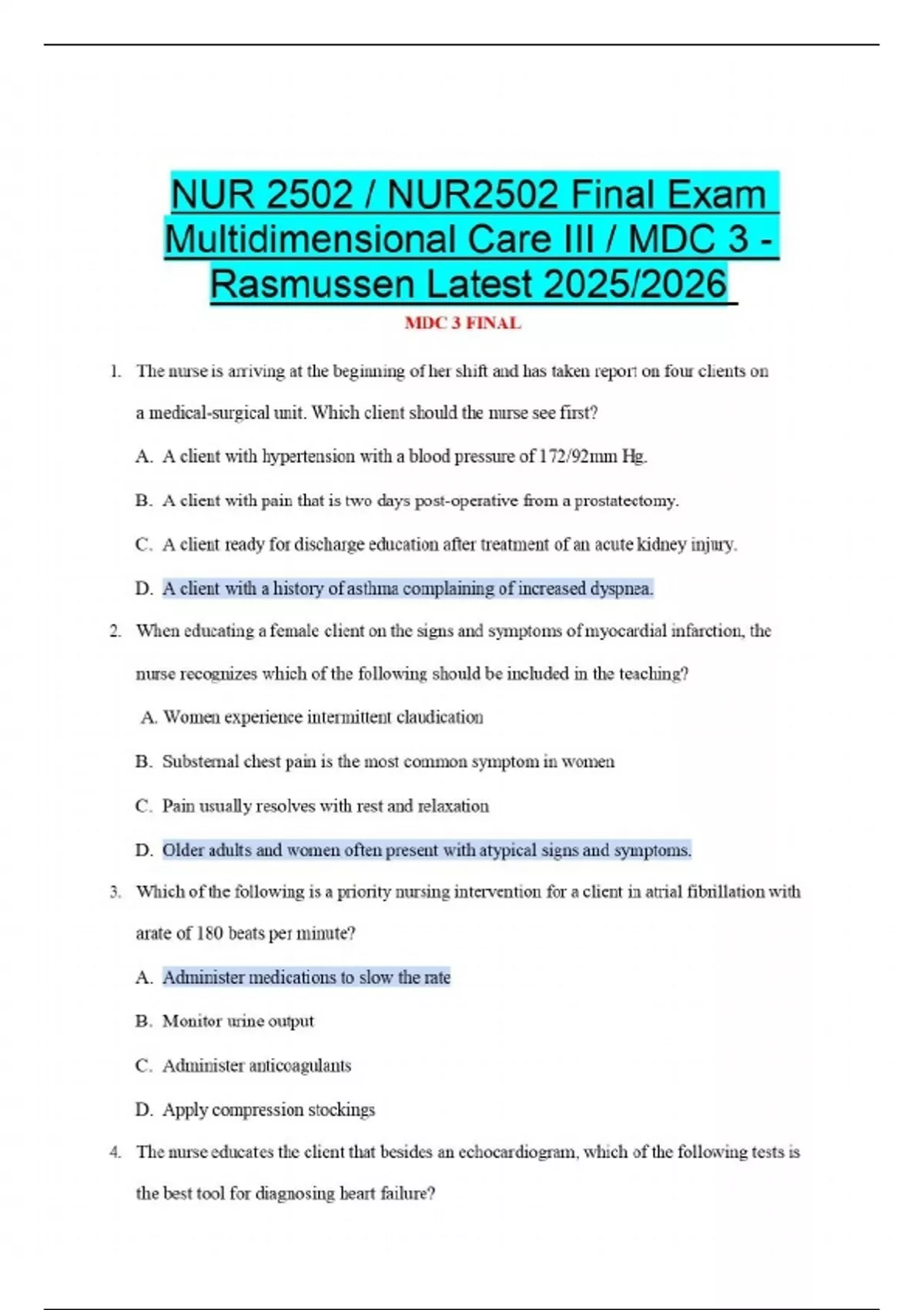 NUR 2502 / NUR2502 Final Exam Multidimensional Care III / MDC 3 - Rasmussen Latest 2025/2026 1. The nurse is arriving at the beginning of her shift and has taken report on four clients on a medical-surgical unit. Which client should the nurse see first? A. A client with hypertension with a blood pressure of 172/92mm Hg. B. A client with pain that is two days post-operative from a prostatectomy. C. A client ready for discharge education after treatment of an acute kidney injury. D. A client with a history of asthma complaining of increased dyspnea. 2. When educating a female client on the signs and symptoms of myocardial infarction, the nurse recognizes which of the following should be included in the teaching? A. Women experience intermittent claudication B. Substernal chest pain is the most common symptom in women C. Pain usually resolves with rest and relaxation