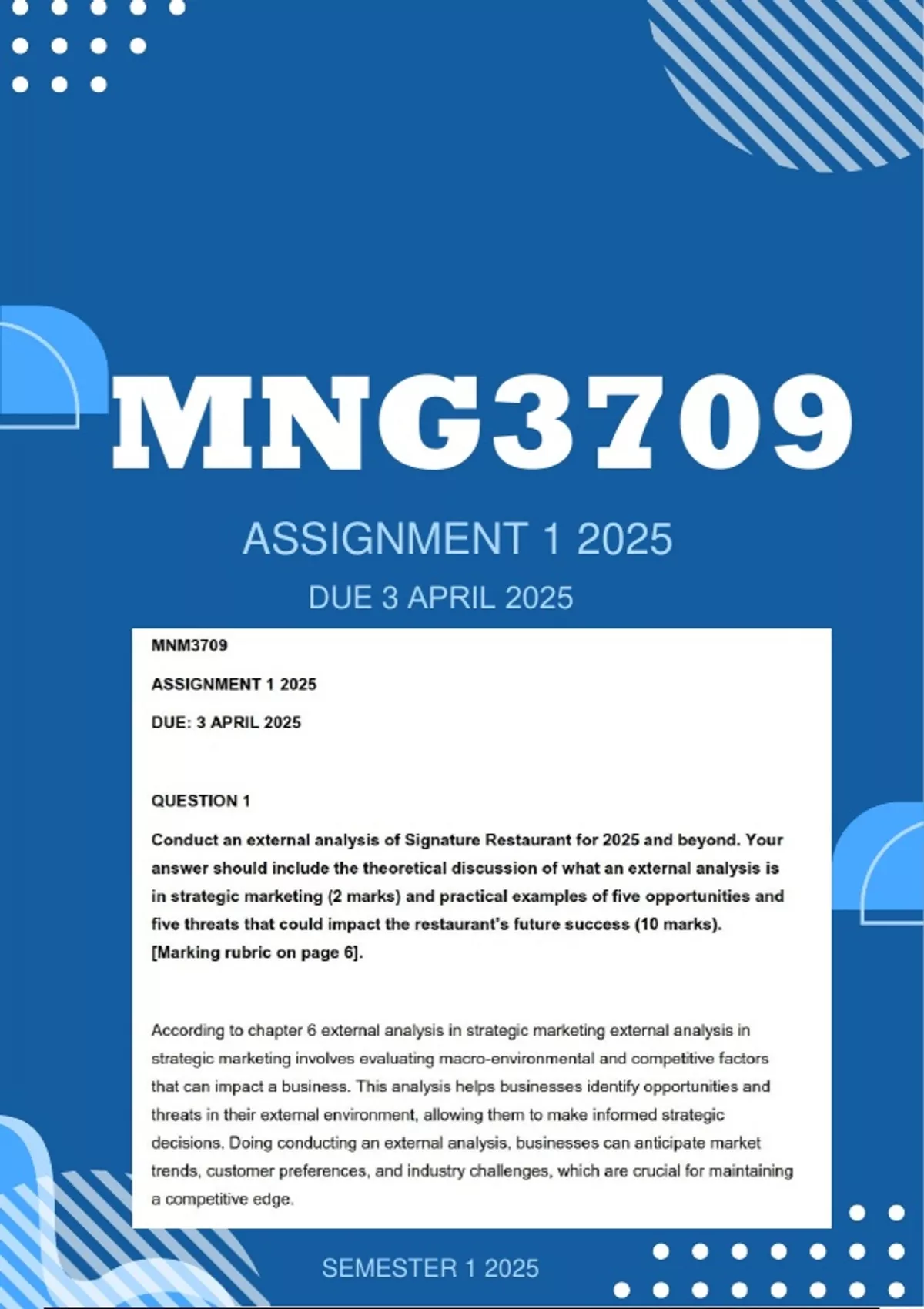 MNM3709 ASSIGNMENT 1 2025 DUE: 3 APRIL 2025 QUESTION 1 Conduct an external analysis of Signature Restaurant for 2025 and beyond. Your answer should include the theoretical discussion of what an external analysis is in strategic marketing (2 marks) and practical examples of five opportunities and five threats that could impact the restaurant’s future success (10 marks). [Marking rubric on page 6]. According to chapter 6 external analysis in strategic marketing external analysis in strategic marketing involves evaluating macro-environmental and competitive factors that can impact a business. This analysis helps businesses identify opportunities and threats in their external environment, allowing them to make informed strategic decisions. Doing conducting an external analysis, businesses can anticipate market trends, customer preferences, and industry challenges, which are crucial for maintaining a competitive edge.