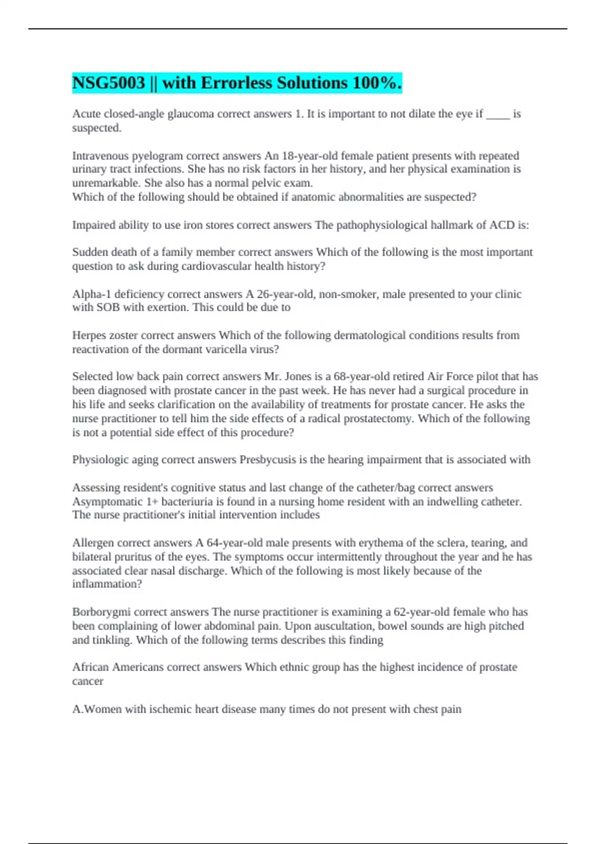 Acute closed-angle glaucoma correct answers 1. It is important to not dilate the eye if ____ is suspected. Intravenous pyelogram correct answers An 18-year-old female patient presents with repeated urinary tract infections. She has no risk factors in her history, and her physical examination is unremarkable. She also has a normal pelvic exam. Which of the following should be obtained if anatomic abnormalities are suspected? Impaired ability to use iron stores correct answers The pathophysiological hallmark of ACD is: Sudden death of a family member correct answers Which of the following is the most important question to ask during cardiovascular health history? Alpha-1 deficiency correct answers A 26-year-old, non-smoker, male presented to your clinic with SOB with exertion. This could be due to Herpes zoster correct answers Which of the following dermatological conditions results from reactivation of the dormant varicella virus? Selected low back pain correct answers Mr. Jones is a 68-year-old retired Air Force pilot that has been diagnosed with prostate cancer in the past week. He has never had a surgical procedure in his life and seeks clarification on the availability of treatments for prostate cancer. He asks the nurse practitioner to tell him the side effects of a radical prostatectomy. Which of the following is not a potential side effect of this procedure? Physiologic aging correct answers Presbycusis is the hearing impairment that is associated with Assessing resident's cognitive status and last change of the catheter/bag correct answers Asymptomatic 1+ bacteriuria is found in a nursing home resident with an indwelling catheter. The nurse practitioner's initial intervention includes Allergen correct answers A 64-year-old male presents with erythema of the sclera, tearing, and bilateral pruritus of the eyes. The symptoms occur intermittently throughout the year and he has associated clear nasal discharge. Which of the following is most likely because of the inflammation? Borborygmi correct answers The nurse practitioner is examining a 62-year-old female who has been complaining of lower abdominal pain. Upon auscultation, bowel sounds are high pitched and tinkling. Which of the following terms describes this finding African Americans correct answers Which ethnic group has the highest incidence of prostate cancer A.Women with ischemic heart disease many times do not present with chest pain