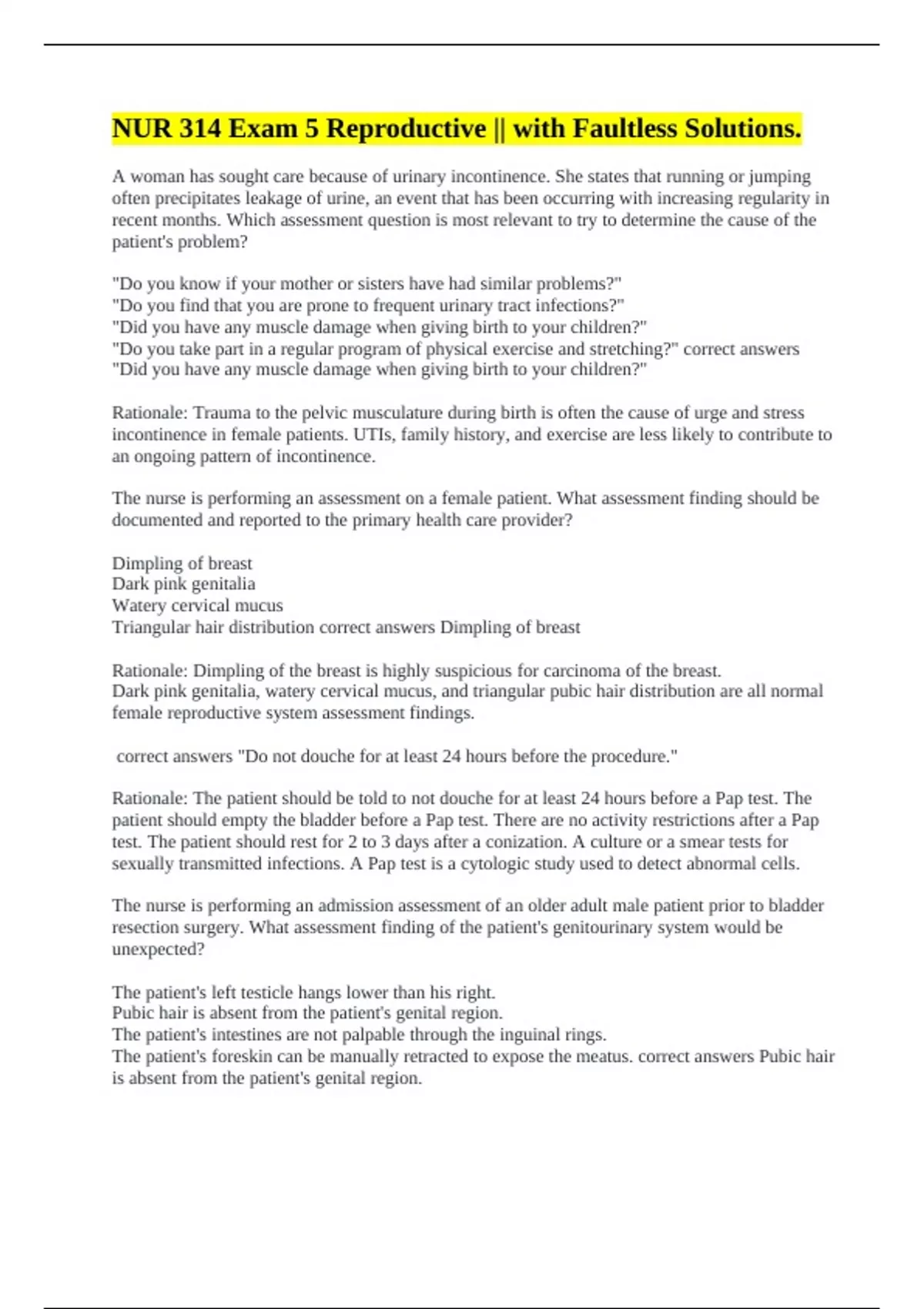 A woman has sought care because of urinary incontinence. She states that running or jumping often precipitates leakage of urine, an event that has been occurring with increasing regularity in recent months. Which assessment question is most relevant to try to determine the cause of the patient's problem? "Do you know if your mother or sisters have had similar problems?" "Do you find that you are prone to frequent urinary tract infections?" "Did you have any muscle damage when giving birth to your children?" "Do you take part in a regular program of physical exercise and stretching?" correct answers "Did you have any muscle damage when giving birth to your children?" Rationale: Trauma to the pelvic musculature during birth is often the cause of urge and stress incontinence in female patients. UTIs, family history, and exercise are less likely to contribute to an ongoing pattern of incontinence. The nurse is performing an assessment on a female patient. What assessment finding should be documented and reported to the primary health care provider? Dimpling of breast Dark pink genitalia Watery cervical mucus Triangular hair distribution correct answers Dimpling of breast Rationale: Dimpling of the breast is highly suspicious for carcinoma of the breast. Dark pink genitalia, watery cervical mucus, and triangular pubic hair distribution are all normal female reproductive system assessment findings. correct answers "Do not douche for at least 24 hours before the procedure." Rationale: The patient should be told to not douche for at least 24 hours before a Pap test. The patient should empty the bladder before a Pap test. There are no activity restrictions after a Pap test. The patient should rest for 2 to 3 days after a conization. A culture or a smear tests for sexually transmitted infections. A Pap test is a cytologic study used to detect abnormal cells. The nurse is performing an admission assessment of an older adult male patient prior to bladder resection surgery. What assessment finding of the patient's genitourinary system would be unexpected? The patient's left testicle hangs lower than his right. Pubic hair is absent from the patient's genital region. The patient's intestines are not palpable through the inguinal rings. The patient's foreskin can be manually retracted to expose the meatus. correct answers Pubic hair is absent from the patient's genital region.