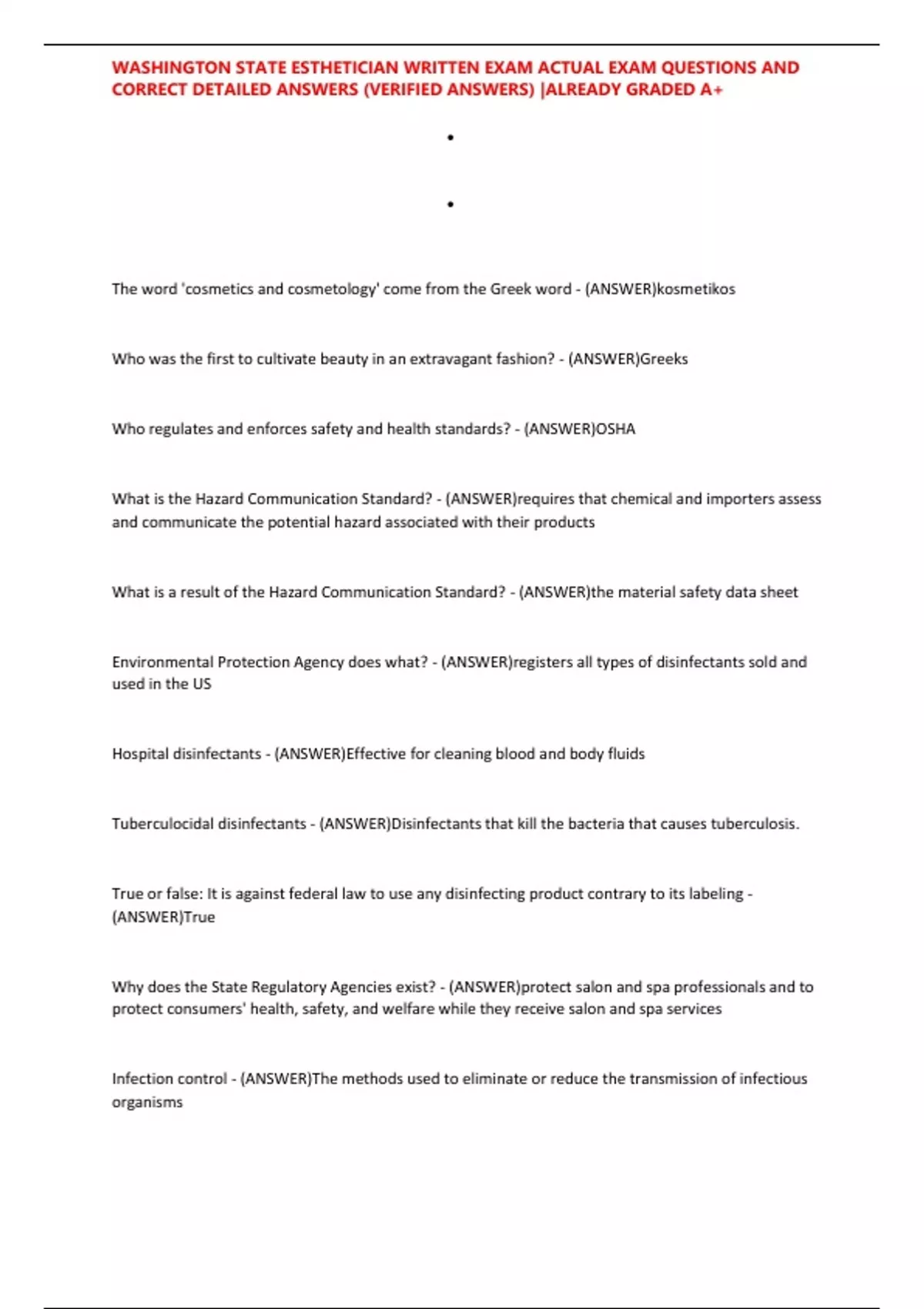 WASHINGTON STATE ESTHETICIAN WRITTEN EXAM ACTUAL EXAM QUESTIONS AND