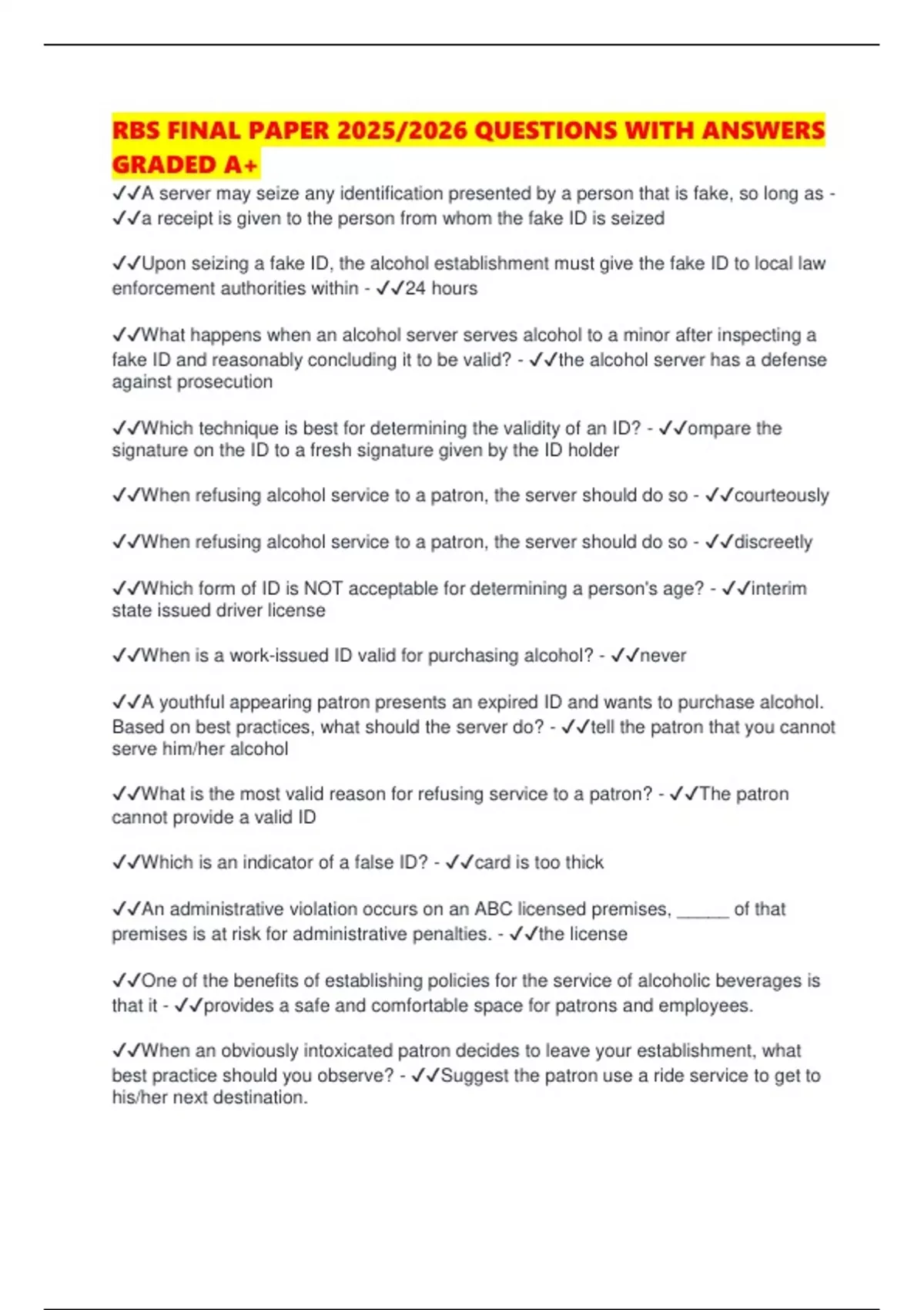 ✔✔When refusing alcohol service to a patron, the server should do so - ✔✔discreetly