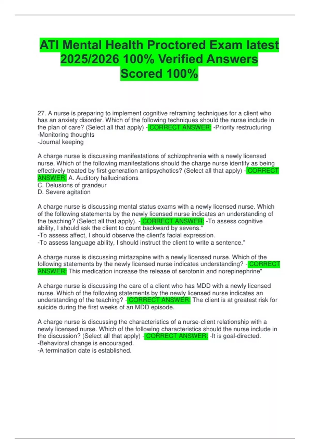 ATI Mental Health Proctored Exam latest 2025/2026 100% Verified Answers Scored 100%