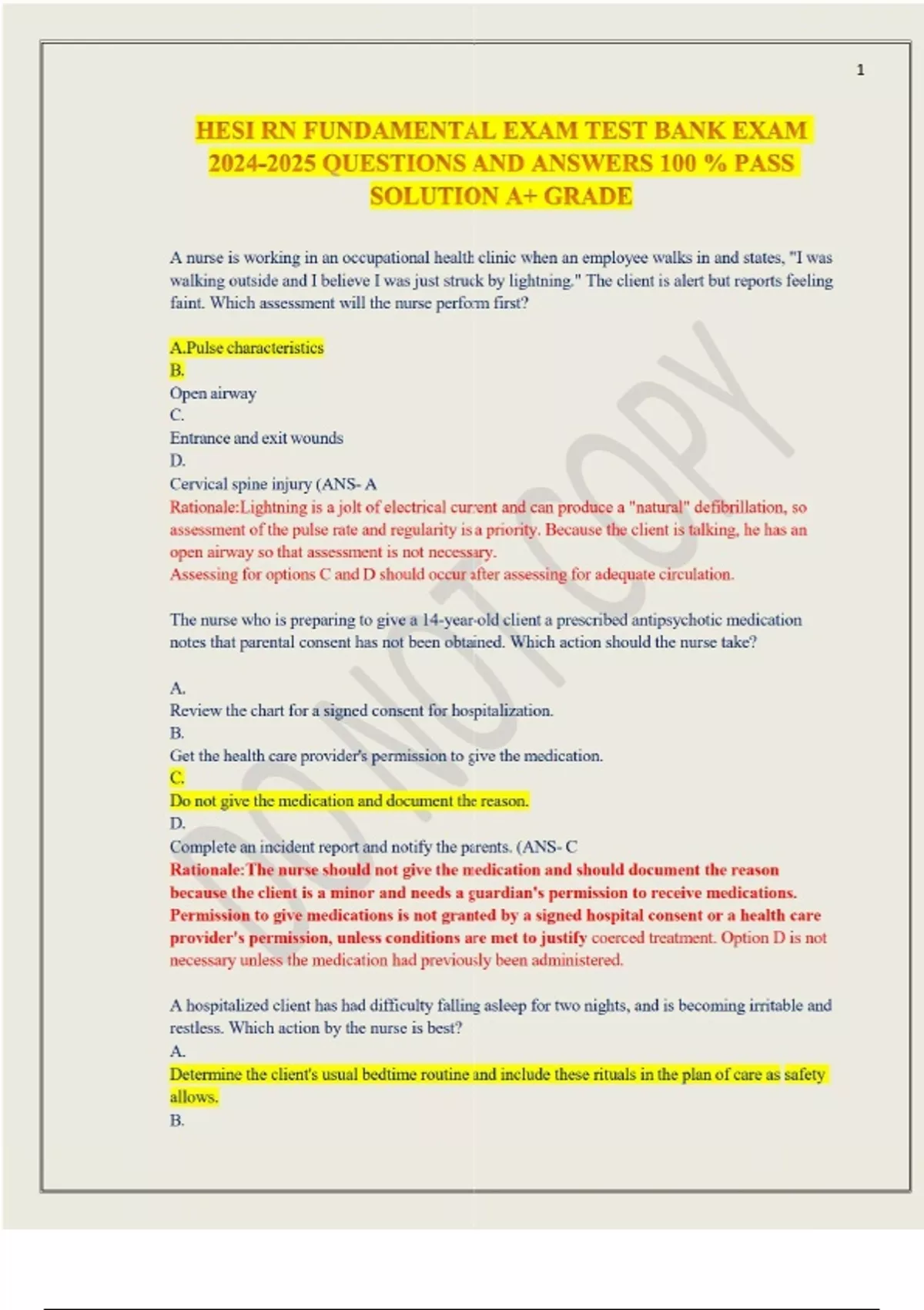 HESI RN FUNDAMENTAL EXAM TEST BANK EXAM QUESTIONS AND ANSWERS 100 % PASS SOLUTION A+ GRADE