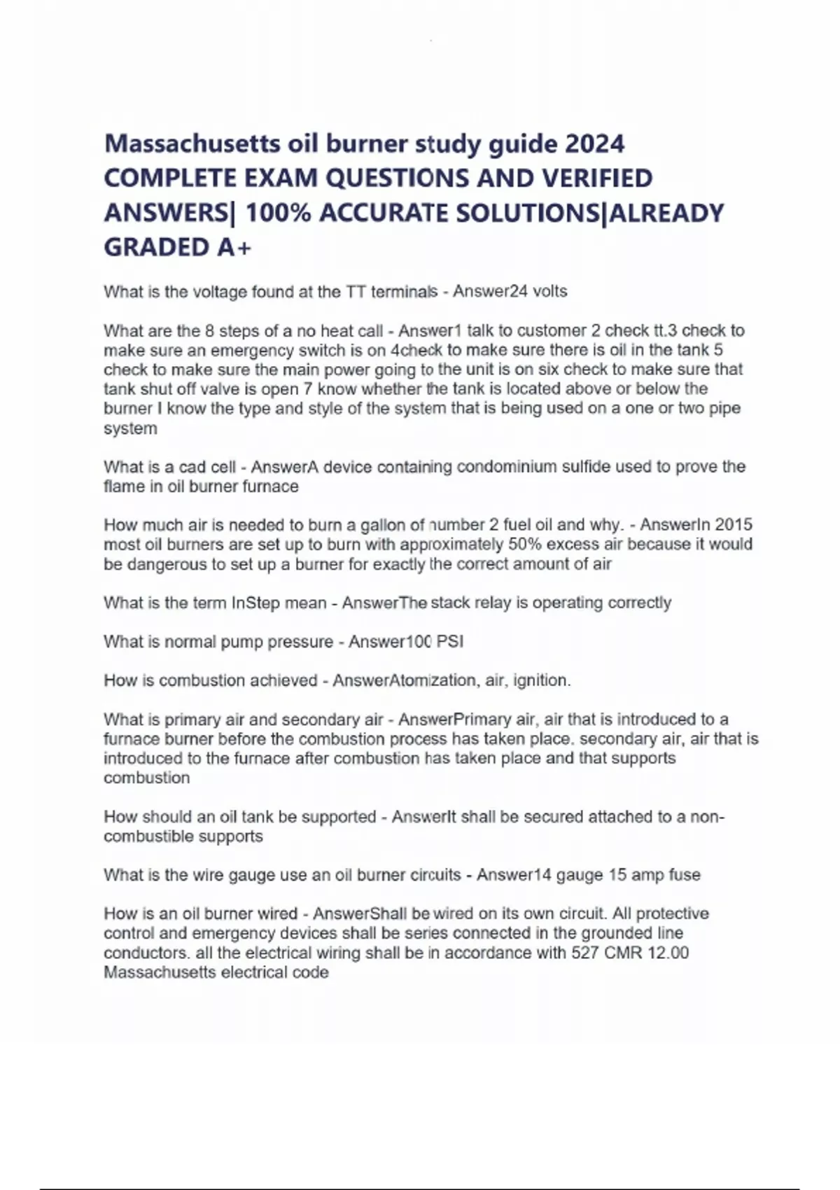 Massachusetts oil burner study guide 2024 COMPLETE EXAM QUESTIONS AND VERIFIED ANSWERS| 100% ACCURATE SOLUTIONS|ALREADY GRADED A+