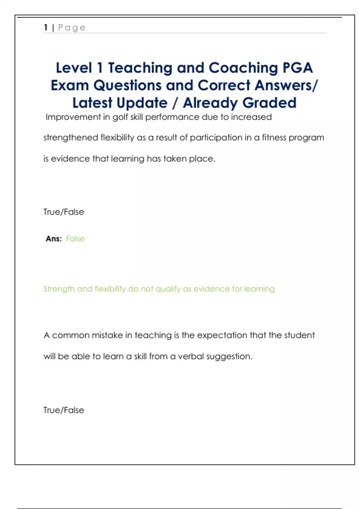 Level 1 Teaching and Coaching PGA Exam Questions and Correct Answers/ Latest Update / Already Graded