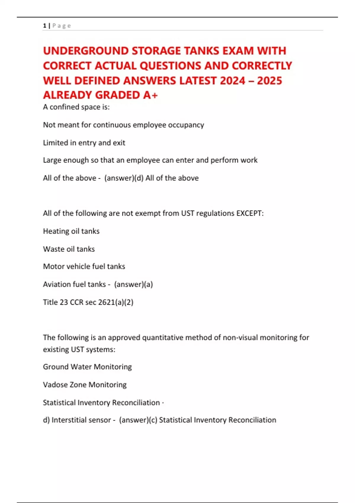 UNDERGROUND STORAGE TANKS EXAM WITH CORRECT ACTUAL QUESTIONS AND CORRECTLY WELL DEFINED ANSWERS LATEST 2024 – 2025 ALREADY GRADED A+