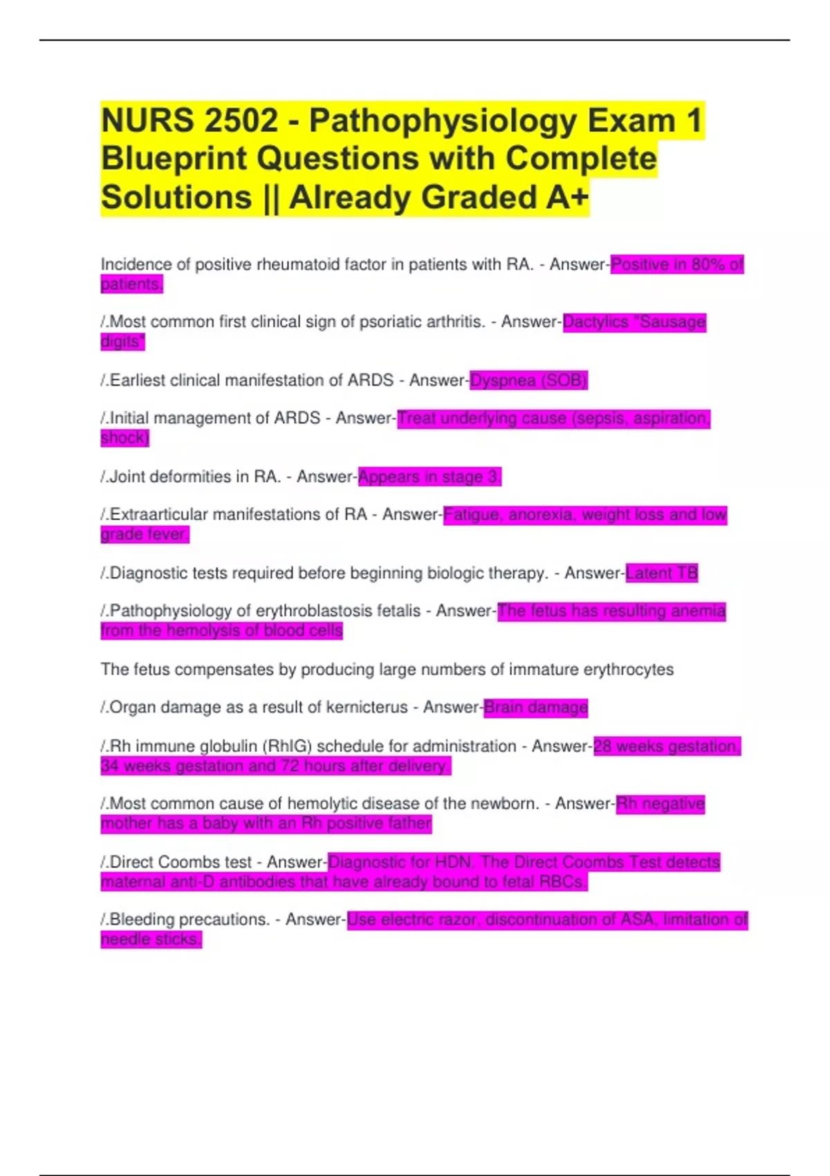NURS 2502 - Pathophysiology Exam 1 Blueprint Questions with Complete Solutions || Already Graded A+ Incidence of positive rheumatoid factor in patients with RA. - Answer-Positive in 80% of patients. /.Most common first clinical sign of psoriatic arthritis. - Answer-Dactylics "Sausage digits" /.Earliest clinical manifestation of ARDS - Answer-Dyspnea (SOB) /.Initial management of ARDS - Answer-Treat underlying cause (sepsis, aspiration, shock) /.Joint deformities in RA. - Answer-Appears in stage 3. /.Extraarticular manifestations of RA - Answer-Fatigue, anorexia, weight loss and low grade fever. /.Diagnostic tests required before beginning biologic therapy. - Answer-Latent TB /.Pathophysiology of erythroblastosis fetalis - Answer-The fetus has resulting anemia from the hemolysis of blood cells The fetus compensates by producing large numbers of immature erythrocytes /.Organ damage as a result of kernicterus - Answer-Brain damage /.Rh immune globulin (RhIG) schedule for administration - Answer-28 weeks gestation, 34 weeks gestation and 72 hours after delivery. /.Most common cause of hemolytic disease of the newborn. - Answer-Rh negative mother has a baby with an Rh positive father /.Direct Coombs test - Answer-Diagnostic for HDN. The Direct Coombs Test detects maternal anti-D antibodies that have already bound to fetal RBCs. /.Bleeding precautions. - Answer-Use electric razor, discontinuation of ASA, limitation of needle sticks.