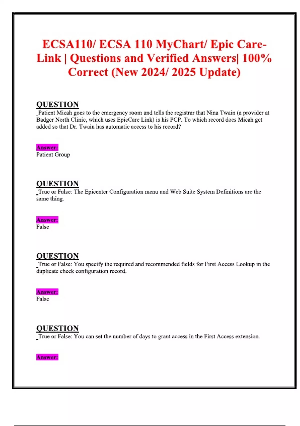 ECSA110 ECSA 110 MyChart Epic Care Link Questions and Verified Answers 100% Correct (New Update)