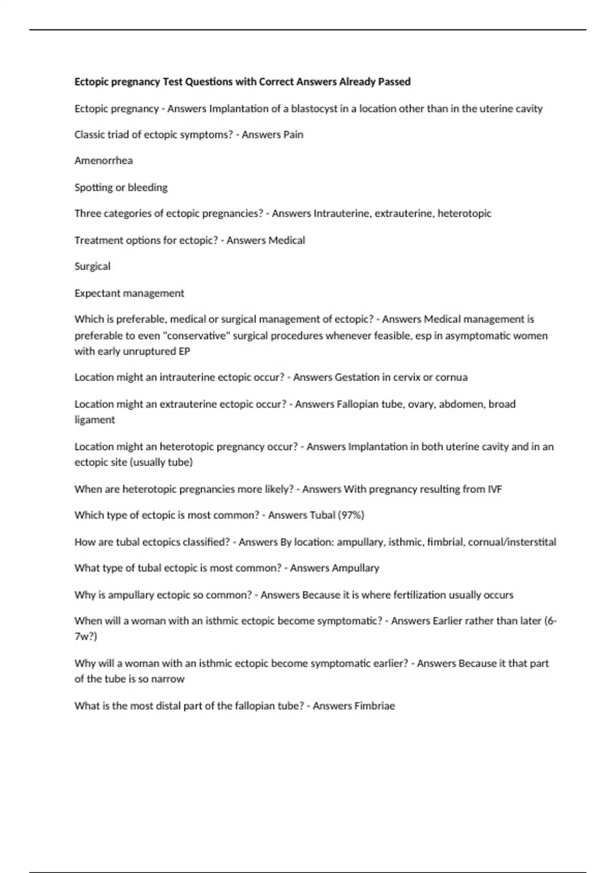 Ectopic pregnancy Test Questions with Correct Answers Already Passed