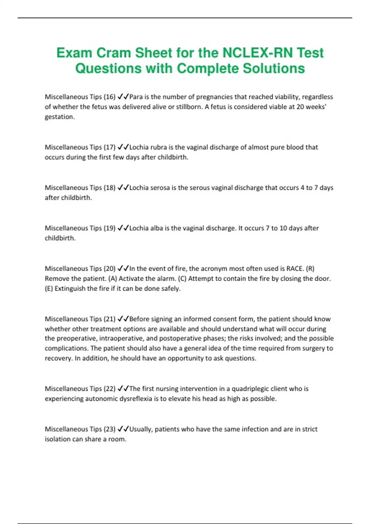 Exam Cram Sheet for the NCLEX-RN Test Questions with Complete Solutions
