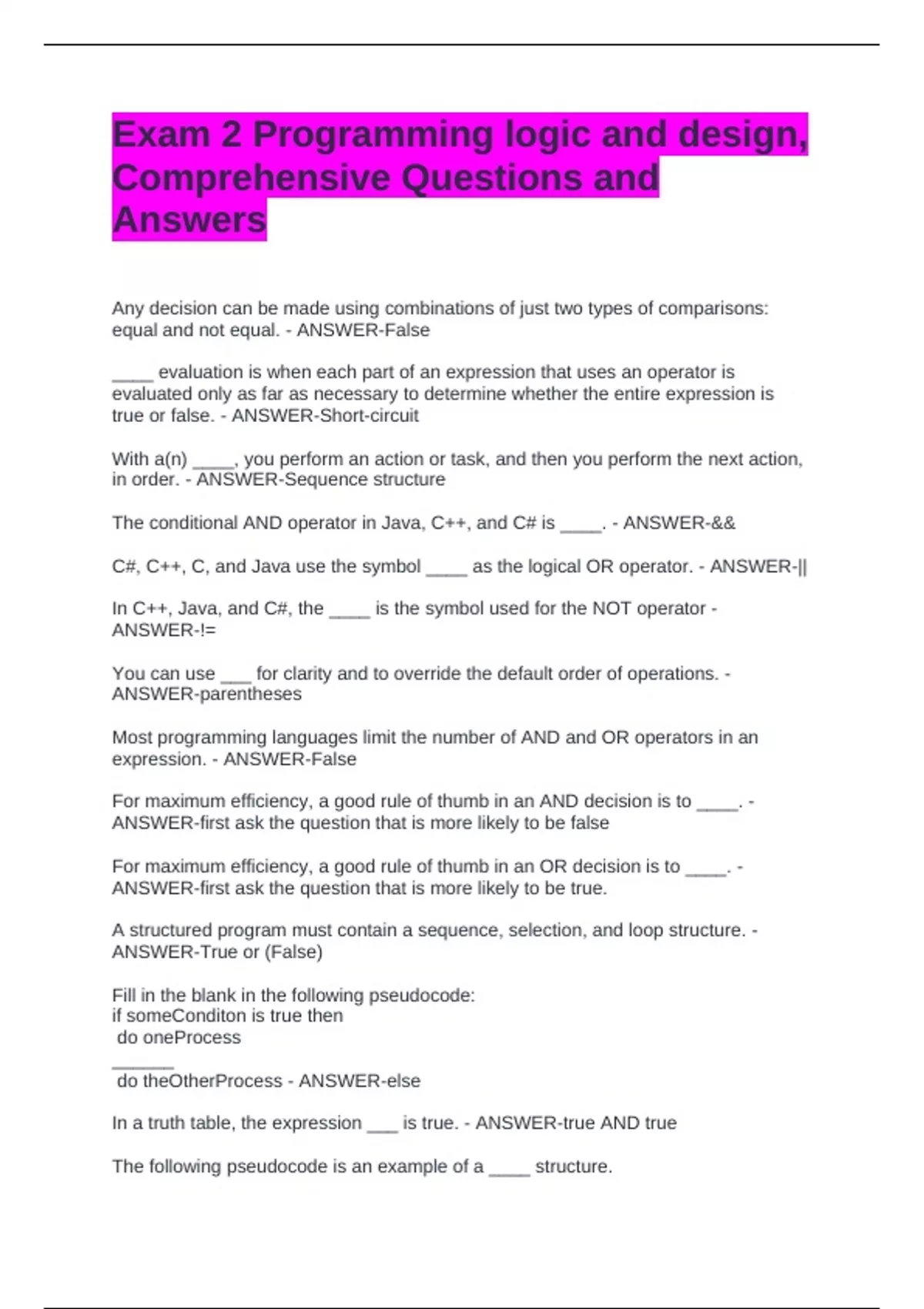 Exam 2 Programming logic and design, Comprehensive Questions and Answers