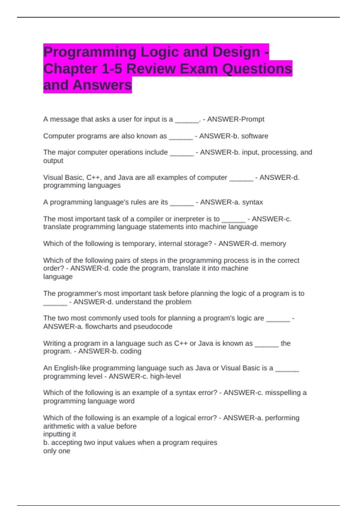 Programming Logic and Design - Chapter 1-5 Review Exam Questions and Answers