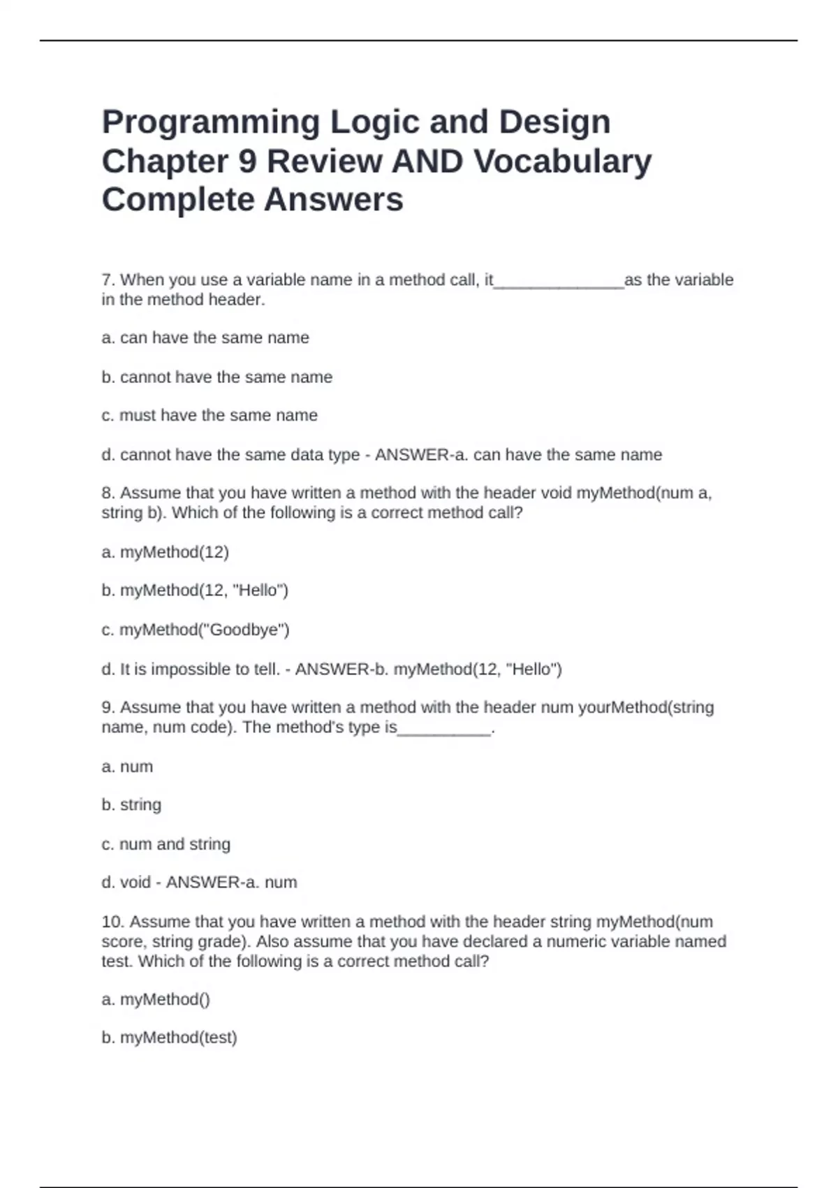10. Assume that you have written a method with the header string myMethod(num