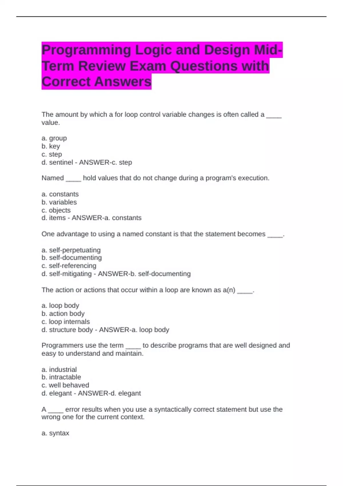 Programming Logic and Design Mid-Term Review Exam Questions with Correct Answers