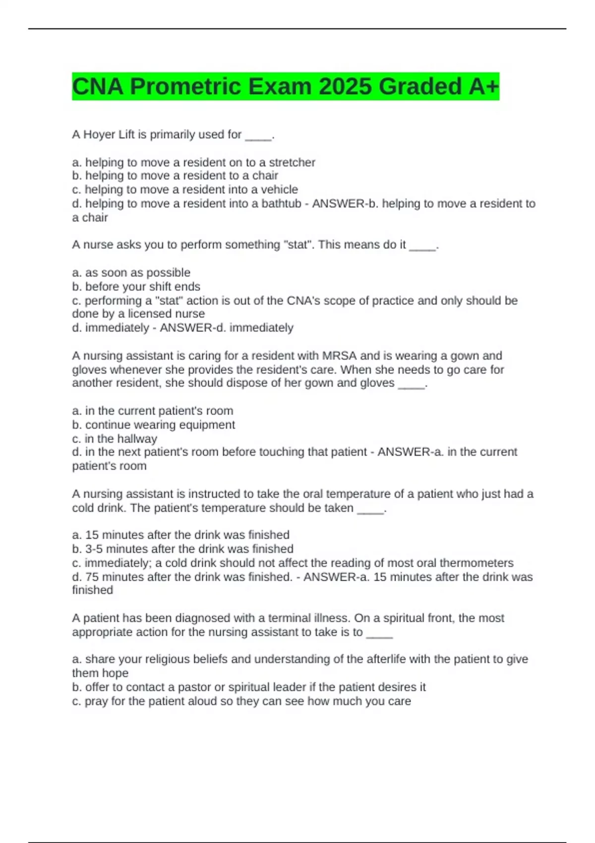 d. helping to move a resident into a bathtub - ANSWER-b. helping to move a resident to