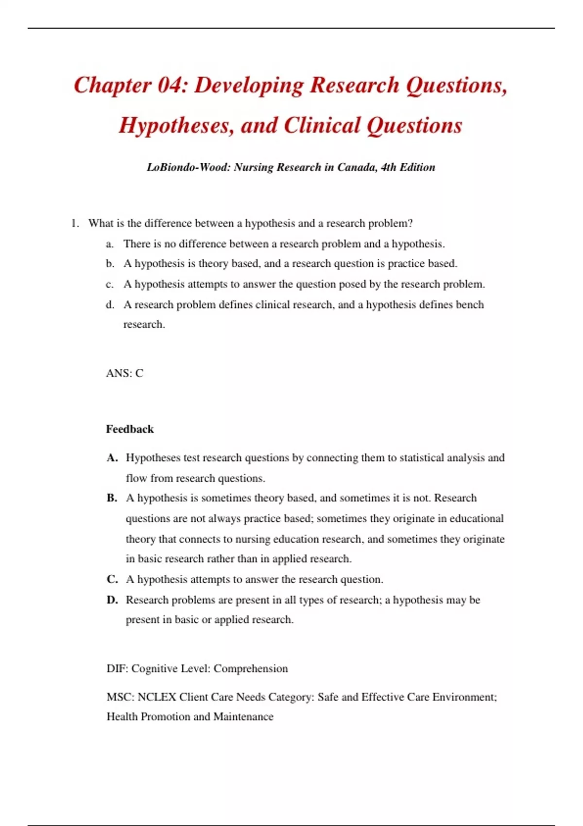 LoBiondo-Wood: Nursing Research in Canada, 4th Edition 1. What is the difference between a hypothesis and a research problem? a. There is no difference between a research problem and a hypothesis. b. A hypothesis is theory based, and a research question is practice based. c. A hypothesis attempts to answer the question posed by the research problem. d. A research problem defines clinical research, and a hypothesis defines bench research. ANS: C Feedback A. Hypotheses test research questions by connecting them to statistical analysis and flow from research questions. B. A hypothesis is sometimes theory based, and sometimes it is not. Research questions are not always practice based; sometimes they originate in educational theory that connects to nursing education research, and sometimes they originate in basic research rather than in applied research. C. A hypothesis attempts to answer the research question. D. Research problems are present in all types of research; a hypothesis may be present in basic or applied research. DIF: Cognitive Level: Comprehension MSC: NCLEX Client Care Needs Category: Safe and Effective Care Environment; Health Promotion and Maintenance 2. How is a hypothesis related to a theory? a. A hypothesis can determine the validity of a theory. b. A hypothesis can be used to evaluate the merit of a theory. c. A theory can determine the validity of a hypothesis. d. A theory can be used to evaluate the merit of a hypothesis. ANS: B Feedback A. A hypothesis bridges theory to the real world and empirical testing. B. The merits of a theory are evaluated through a hypothesis. C. A hypothesis tests the validity of a theory’s assumptions. D. A theory being used to evaluate the merit of a hypothesis is the reverse of the correct answer. DIF: Cognitive Level: Knowledge MSC: NCLEX Client Care Needs Category: Safe and Effective Care Environment; Health Promotion and Maintenance 3. Which of the following statements represents a potential area of research? a. “Most of our admissions occur at night.” b. “It is difficult to find personnel willing to work the night shift.” c. “It seems that most of the patient falls on our unit occur during the night shift.” d. “The night shift personnel are not attending promptly to the needs of our patient.”