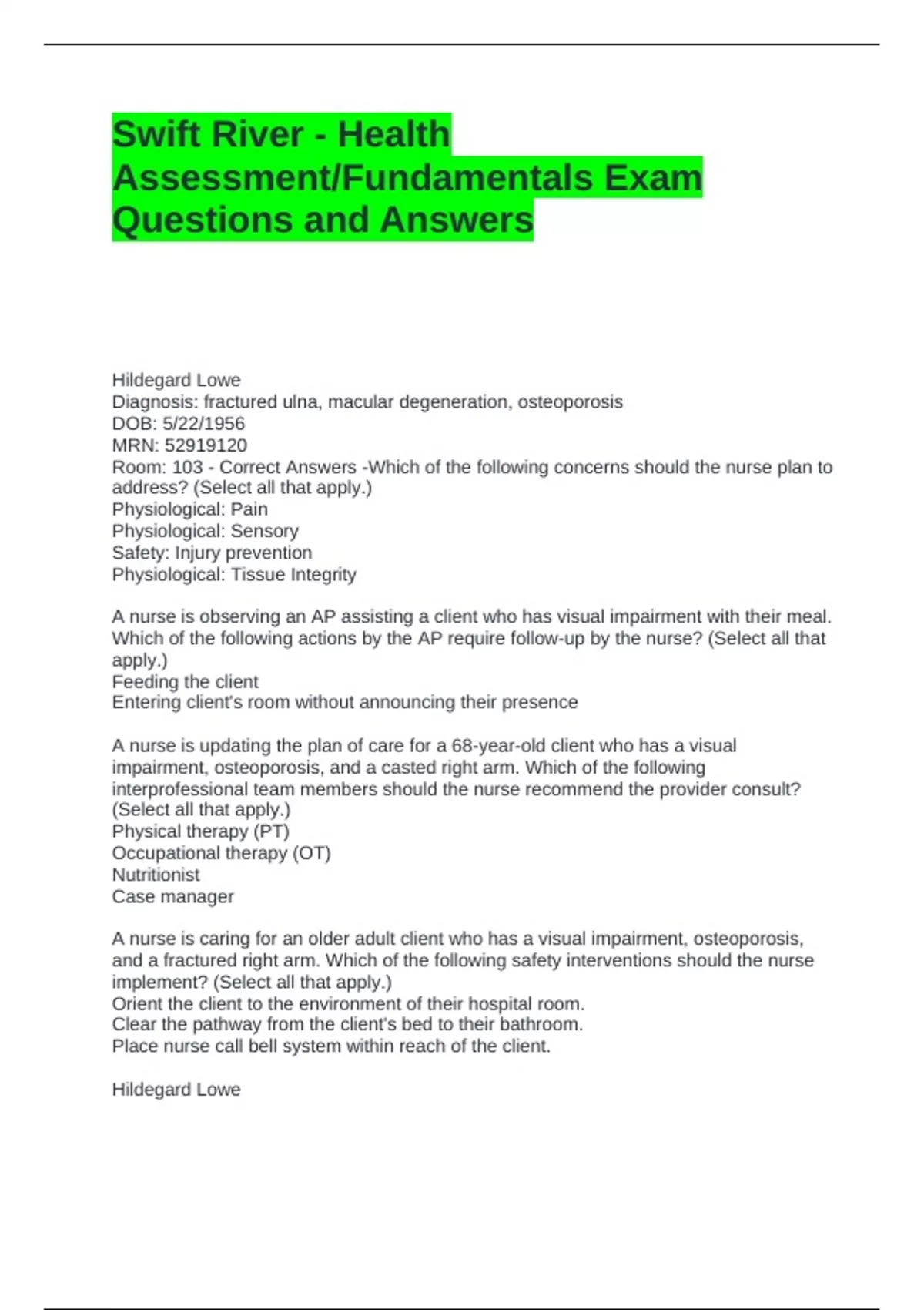 Swift River - Health Assessment-Fundamentals Exam Questions and Answers
