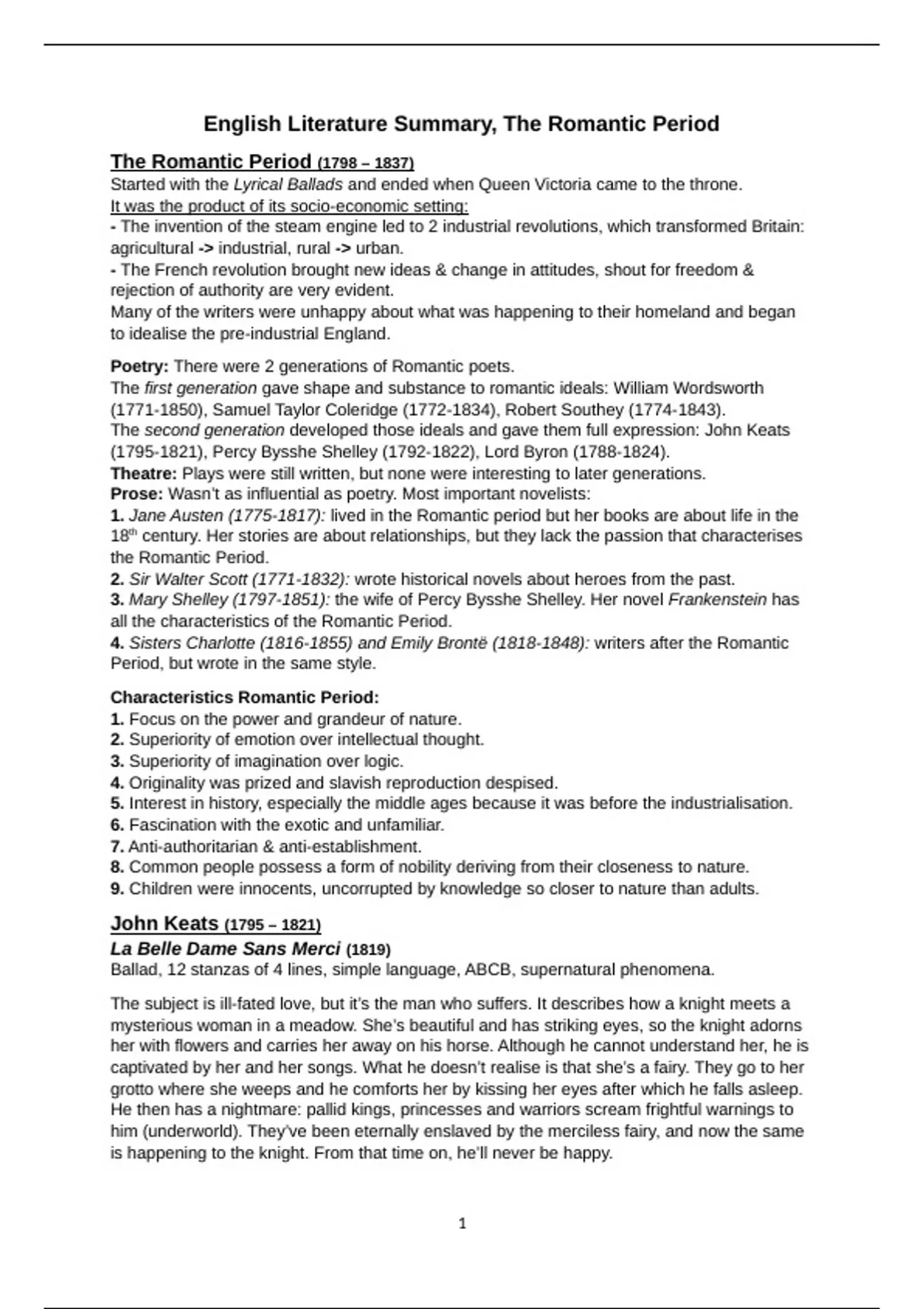 Deze samenvatting gaat over het hele boekje van Alquin Romantic Period (VWO), die veel bekende Engelse Literatuur behandeld (boeken en gedichten). De behandelde onderwerpen zijn: The Romantic Period (met characteristics), John Keats: La Belle Dame Sans Merci & To Autumn, George Gordon / Lord Byron: She Walks in Beauty, Samuel Taylor Coleridge: The Rime of the Ancient Mariner, Percy Bysshe Shelley: England in 1819, William Blake: The Tyger & The Chimney Sweeper, William Wordsworth: I Wandered Lonely As A Cloud & We Are Seven (+ characteristics of a medieval ballad), Jane Austen: Pride and Prejudice. Deze samenvatting is geschreven in het Engels. Ik ben nu zelf student Engels op de universiteit en ben ook half Engels dus je kan zeker hierop rekenen ;)