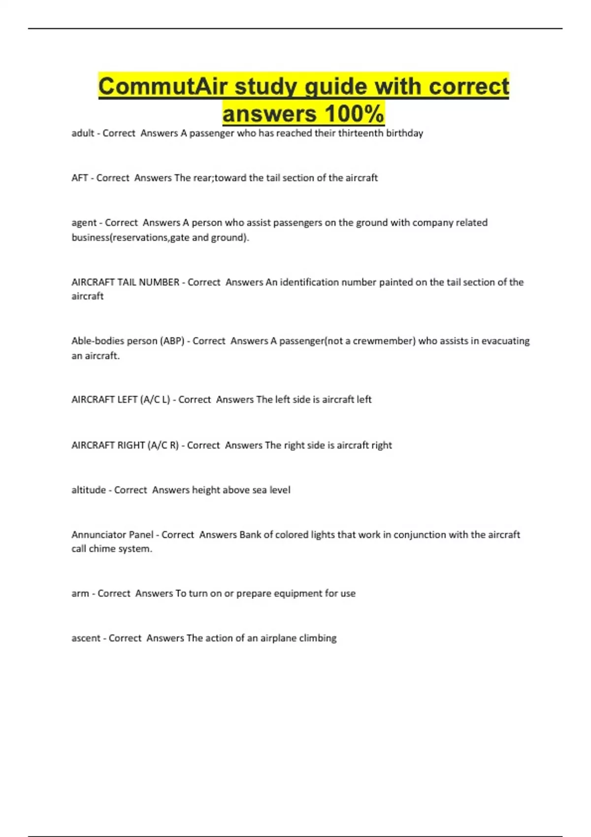 CommutAir study guide with correct answers 100% adult - Correct Answers A passenger who has reached their thirteenth birthday AFT - Correct Answers The rear;toward the tail section of the aircraft agent - Correct Answers A person who assist passengers on the ground with company related business(reservations,gate and ground). AIRCRAFT TAIL NUMBER - Correct Answers An identification number painted on the tail section of the aircraft Able-bodies person (ABP) - Correct Answers A passenger(not a crewmember) who assists in evacuating an aircraft. AIRCRAFT LEFT (A/C L) - Correct Answers The left side is aircraft left AIRCRAFT RIGHT (A/C R) - Correct Answers The right side is aircraft right altitude - Correct Answers height above sea level Annunciator Panel - Correct Answers Bank of colored lights that work in conjunction with the aircraft call chime system. arm - Correct Answers To turn on or prepare equipment for use ascent - Correct Answers The action of an airplane climbing Auxiliary Power Unit (APU) - Correct Answers A small engine used to operate a generator that supplies direct current power to an aircraft when the engines are shut down. This generator is typically used to power the air and lights while the aircraft is parked at the gate. ballast - Correct Answers Weight added to an aircraft to keep it in proper weight and balance. bidding - Correct Answers The procedure that crew members are awarded monthly and vacation schedules. Block Time - Correct Answers The time the blocks are pulled from beneath the aircraft wheels prior to taxi until the blocks are replaced upon completion of the flight. boarding pass - Correct Answers Card issued to passengers prior to boarding,showing date,destination and flight number.Each passenger must have a boarding pass before he/she can board an aircraft. briefing - Correct Answers The instructions concerning procedures and particulars Bulkhead - Correct Answers The partition or wall separating various compartments in an aircraft bump - Correct Answers The removal of a passenger,normally non-revenue,from a flight for weight/balance considerations or because the flight is full. cabin - Correct Answers The section of the aircraft for passenger seating Captain(CA) - Correct Answers The pilot responsible for the entire aircraft including crew and ies left seat. carousel - Correct Answers A company involved in the transportation of people. CARRY-OUT CART (Plane side checked baggage cart) - Correct Answers Cart, on which passengers can leave carry-on bags before boarding the aircraft and pick them up immediately after exiting the aircraft. Check ride (FAA) - Correct Answers An evaluation given to a crew member by a qualified FAA official or other designated person Center of Gravity (COG) - Correct Answers The center of gravity of the aircraft depending on weight and balance of the loads. child - Correct Answers A passenger who is at least two years of age,but has not reached their thirteenth birthday circuit breaker - Correct Answers A current-limiting device (a fuse) that can be reset. A system used in electrical circuits to prevent the system from overloading clearance - Correct Answers The approval given for an airplane to fly specified route in the flight plan Comat - Correct Answers Company material usually shipped on company aircraft concourse - Correct Answers A large hallway which leads to the area where aircraft are parked for passenger boarding cowling - Correct Answers The material that encloses an engine crew member - Correct Answers A qualified individual assigned by an air carrier for the performing of duties on the airplane. Crew Scheduling - Correct Answers The department that handles scheduling of all flight crews. Critical Phase of Flight - Correct Answers All ground operations involving taxi,takeoff,landing and all other flight operations conducted below 10,000 feet. cruising altitude - Correct Answers The height at which an aircraft flies for the majority of flight after ascent and before descent. Deadhead (DH) - Correct Answers The transportation of crew members from one point to another to position for a trip or return to home base. Decompression - Correct Answers When the cabin pressurization system has failed and the atmosphere inside the aircraft equals the air outside the aircraft de-ice - Correct Answers Removing ice from the wings with warm air from the engines, by inflation of "boots" on the leading edge of aircraft surfaces, or by chemical means on the ground. delay - Correct Answers Occurs when a flight operates behind schedules Deplane - Correct Answers Term used to denote customers leaving or exiting the aircraft Demonstration(demo) - Correct Answers The showing of passengers the usage of various types of emergency equipment and/or exit locations. Descent - Correct Answers The movement of an aircraft from a higher to lower altitude. Direct flight - Correct Answers A flight, regardless of the number of intermediate stops, which normally does not require transfer to another aircraft. Dispatch (DISP) - Correct Answers Licensed operators who have the responsibility of scheduling and monitoring all aircraft and crew. Ditching - Correct Answers Term used for a water landing and evacuation of an aircraft Domicile - Correct Answers An airline crew base Don - Correct Answers To put on Draft - Correct Answers Mandatory assignment of a flight attendant to duty on a day off. Duty time - Correct Answers The time a flight attendant is on duty. Duty time begins 40 minutes prior to scheduled departure time of the first flight of flying sequence and extends to 10 minutes after the termination of the last flight of a flying sequence.