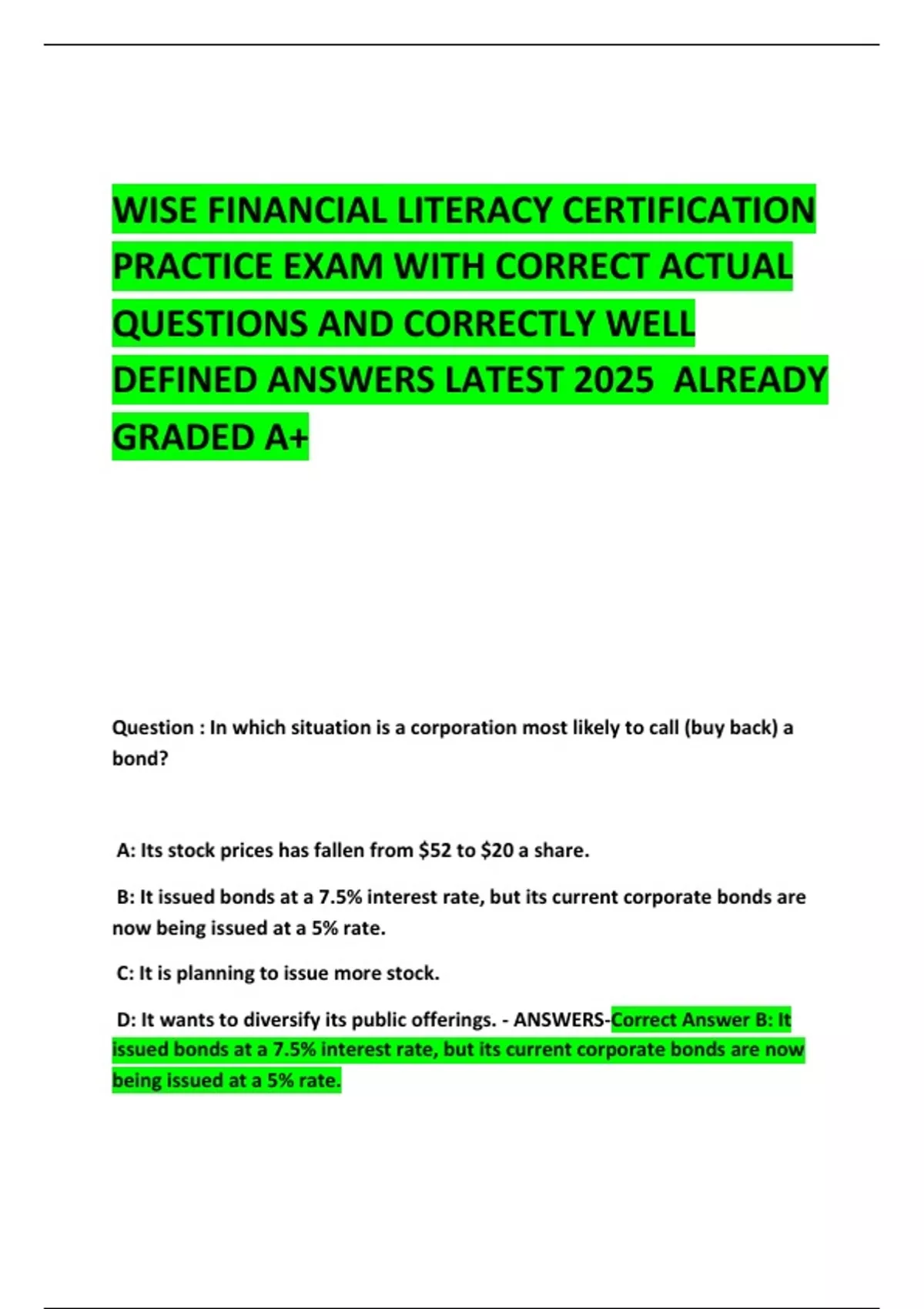 WISE FINANCIAL LITERACY CERTIFICATION PRACTICE EXAM WITH CORRECT ACTUAL QUESTIONS AND CORRECTLY WELL DEFINED ANSWERS LATEST 2025 ALREADY GRADED A+