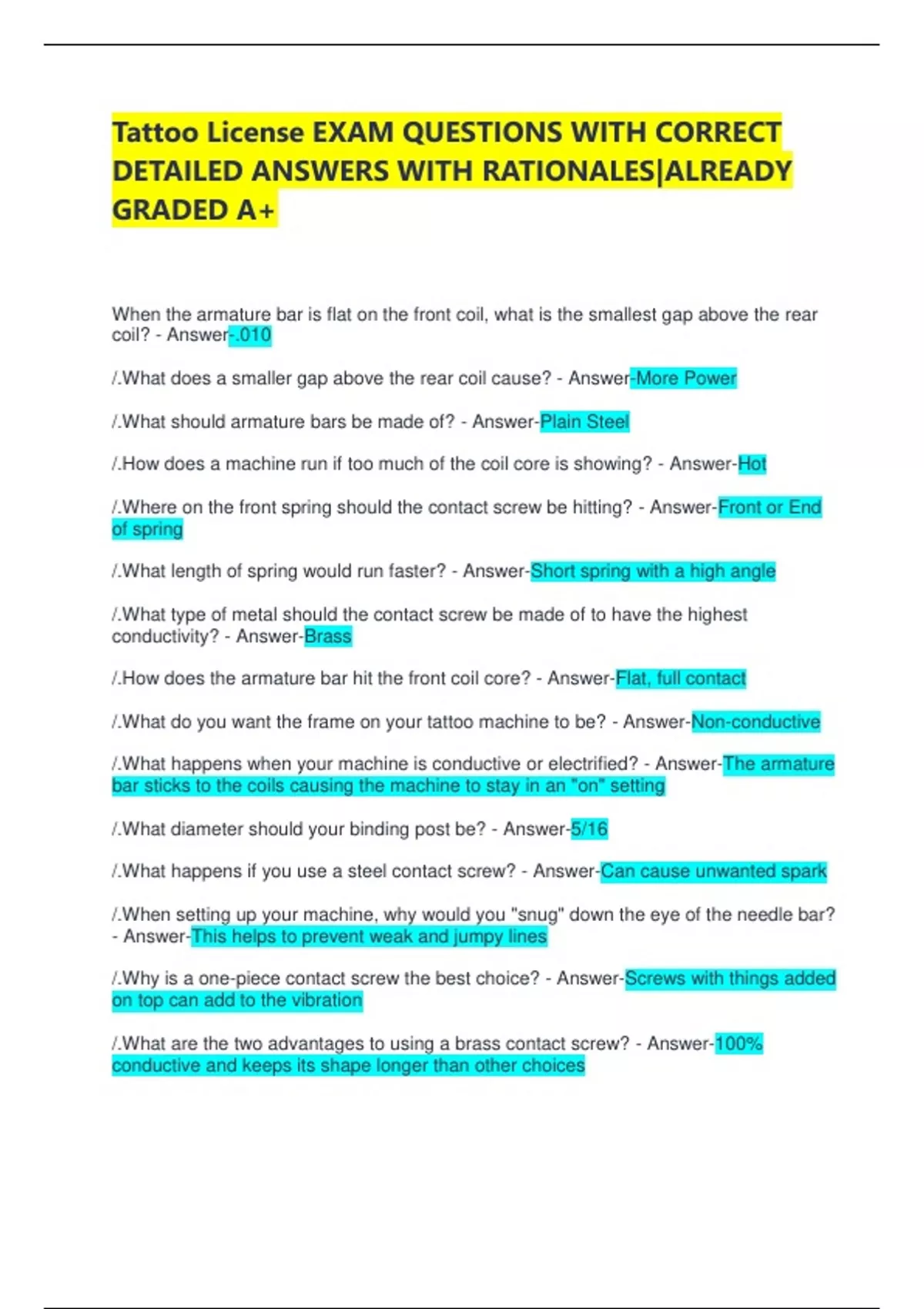 Tattoo License EXAM QUESTIONS WITH CORRECT DETAILED ANSWERS WITH RATIONALES|ALREADY GRADED A+ When the armature bar is flat on the front coil, what is the smallest gap above the rear coil? - Answer-.010 /.What does a smaller gap above the rear coil cause? - Answer-More Power /.What should armature bars be made of? - Answer-Plain Steel /.How does a machine run if too much of the coil core is showing? - Answer-Hot /.Where on the front spring should the contact screw be hitting? - Answer-Front or End of spring /.What length of spring would run faster? - Answer-Short spring with a high angle /.What type of metal should the contact screw be made of to have the highest conductivity? - Answer-Brass /.How does the armature bar hit the front coil core? - Answer-Flat, full contact /.What do you want the frame on your tattoo machine to be? - Answer-Non-conductive /.What happens when your machine is conductive or electrified? - Answer-The armature bar sticks to the coils causing the machine to stay in an "on" setting /.What diameter should your binding post be? - Answer-5/16 /.What happens if you use a steel contact screw? - Answer-Can cause unwanted spark /.When setting up your machine, why would you "snug" down the eye of the needle bar? - Answer-This helps to prevent weak and jumpy lines /.Why is a one-piece contact screw the best choice? - Answer-Screws with things added on top can add to the vibration /.What are the two advantages to using a brass contact screw? - Answer-100% conductive and keeps its shape longer than other choices /.How much of the contact screw needs to be touching the front spring? - Answer-A tiny contact area /.Why should you use plain steel for a spring rather than a coated spring? - Answer-The coating wears away quickly, which causes a bad connection /.What kind of reaction can you expect from a machine with a very low spring angle? - Answer-Spongy and weak /.Which type of machine benefits the best from a shorter spring? - Answer-A liner /.Which spring is the most important for tuning the machine? - Answer-The rear spring /.A machine that is very hard hitting and fast running moves the needle in and out of the skins so fast that ____________________________________? - Answer-It doesn't leave enough pigment behind /.What is the ideal width of the springs used on the machine? - Answer-The springs should be just as wide as the part that they are attached to /.What types of screws should you use to hold the coils to the frame? - Answer-Always use a magnetic screw that sits flush to the frame /.What is the function of the tube vise? - Answer-Firmly hold the tube in place and properly align the tube while the machine is in use /.How should a tube vise hold a tube in comparison to the machine? - Answer-Squarely front to back and side to side /.What is the most important part of a tattoo machine? - Answer-Coils /.What is the purpose of the coils of a tattoo machine? - Answer-To run consistently and not lose power /.What is a possible reason for the machine to not work at all? - Answer-There is debris between the contact screw and the front spring /.What can cause the coils to be in a constant "on" position? - Answer-A coil wire, soldering lug, or any of the electrical circuit is touching the frame /.What does your frame act as for the coil circuit? - Answer-The ground /.What is not a purpose of the binding posts? - Answer-Electrical contact from the soldering lugs to the contact screw /.What is a safety feature of the cartridge needles? - Answer-If the cartridge is not installed in the machine or tube, then the needles are not exposed; this limits the possibility of a needlestick /.What does EPA stand for? - Answer-Environmental Protection Agency /.What does FDA stand for? - Answer-Food and Drug Administration /.What does "high level disinfectant" mean? - Answer-A chemical agent, registered with the EPA, which has demonstrated tuberculocidal activity /."Office" in the tattoo laws refers to what? - Answer-Health licensing Office /.What attributes does a container have to have to be considered a "Sharps" container? - Answer-Puncture-resistant, leak proof, labeled with a biohazard symbol /.How many hours are part of the tattoo licensing program? - Answer-360 hours consisting of 210 theory hours and 150 practical hours /.What does a completed procedure mean? - Answer-A tattoo which has been finished on a live human being, including any touchups or additional work following initial healing, and the client is released from service /.How long is a tattoo license active for? - Answer-1 year /.What documents does one have to have to apply for a tattoo license? - Answer-Completed application, bloodborne pathogen training certificate, CPR/first aid training certificate, government issued id, second form of id, high school diploma or GED equivalent, and training from a tattoo program approved by the Higher Education Coordinating Commission /.How long is a temporary tattoo license good for? - Answer-Not to exceed 30 consecutive calendar days /.How many times in a 12-month period can one person apply for a temporary tattoo license? - Answer-2 /.How often does a license tattoo artist need to renew their license? - Answer-Once a year /.A license can be inactive for how long before it is considered an expired license? - Answer-3 years /.How many hours of continuing education does a licensee have to complete in 1 year? - Answer-10 hours When the armature bar is flat on the front coil, what is the smallest gap above the rear coil? - Answer-.010 /.What does a smaller gap above the rear coil cause? - Answer-More Power /.What should armature bars be made of? - Answer-Plain Steel /.How does a machine run if too much of the coil core is showing? - Answer-Hot /.Where on the front spring should the contact screw be hitting? - Answer-Front or End of spring /.What length of spring would run faster? - Answer-Short spring with a high angle /.What type of metal should the contact screw be made of to have the h