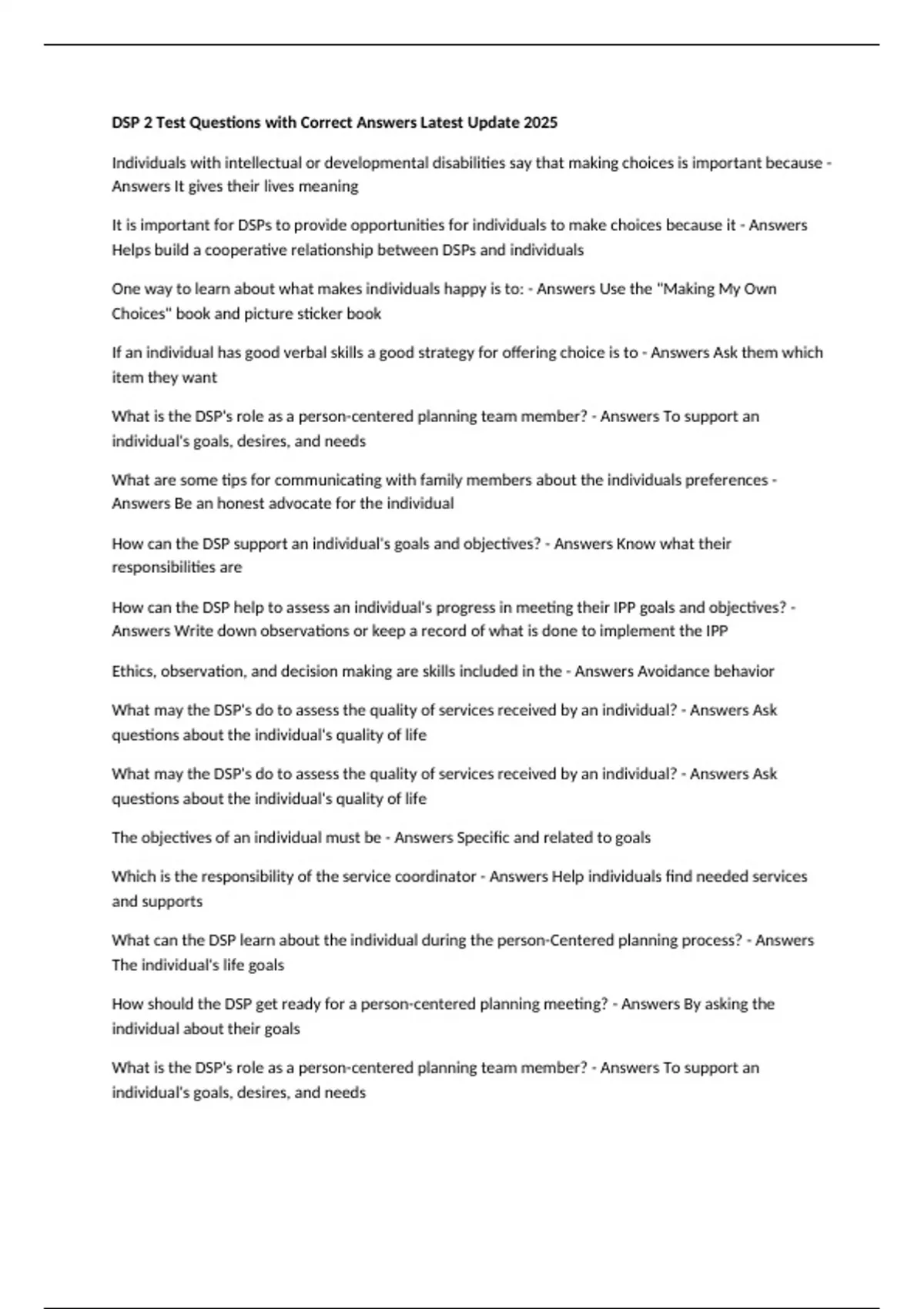 DSP 2 Test Questions with Correct Answers Latest Update 2025 Individuals with intellectual or developmental disabilities say that making choices is important because - Answers It gives their lives meaning It is important for DSPs to provide opportunities for individuals to make choices because it - Answers Helps build a cooperative relationship between DSPs and individuals One way to learn about what makes individuals happy is to: - Answers Use the "Making My Own Choices" book and picture sticker book If an individual has good verbal skills a good strategy for offering choice is to - Answers Ask them which item they want What is the DSP's role as a person-centered planning team member? - Answers To support an individual's goals, desires, and needs What are some tips for communicating with family members about the individuals preferences - Answers Be an honest advocate for the individual How can the DSP support an individual's goals and objectives? - Answers Know what their responsibilities are How can the DSP help to assess an individual's progress in meeting their IPP goals and objectives? - Answers Write down observations or keep a record of what is done to implement the IPP Ethics, observation, and decision making are skills included in the - Answers Avoidance behavior What may the DSP's do to assess the quality of services received by an individual? - Answers Ask questions about the individual's quality of life What may the DSP's do to assess the quality of services received by an individual? - Answers Ask questions about the individual's quality of life The objectives of an individual must be - Answers Specific and related to goals Which is the responsibility of the service coordinator - Answers Help individuals find needed services and supports What can the DSP learn about the individual during the person-Centered planning process? - Answers The individual's life goals How should the DSP get ready for a person-centered planning meeting? - Answers By asking the individual about their goals What is the DSP's role as a person-centered planning team member? - Answers To support an individual's goals, desires, and needs What are some tips for communicating with family members about the individuals preferences - Answers Be an honest advocate for the individual How can the DSP support an individual's goals and objectives? - Answers Know what their responsibilities are How can the DSP help to assess an individual's progress in meeting their IPP goals and objectives - Answers Write down observations or keep a record of what is done to implement the IPP Ethics, observation, and decision making are skills included in - Answers DSP toolbox What may the DSP's do to assess the quality of services received by an individual? - Answers Ask questions about the individual's quality of life The objectives of an individual must be - Answers Specific and related to goals Which is the responsibility of the service coordinator - Answers Help individuals find needed services and supports What is one thing the DSP should do before the doctor writes the order for a medication - Answers Tell the doctor about other medications being taken by the individual What is one way to help avoid interactions between multiple medications the individual is taking - Answers Use the same pharmacy for all of the individual's medication needs When should a medication dose be recorded in an individuals MAR - Answers At the time the medication is taken by the individual Which of the following is not included on a medication label - Answers A list of other medications the individual is taking Which of the following information could you get from a medication information sheet - Answers The possible side effects of the medication Which classification of medication is used to treat epilepsy - Answers Anticonvulsants Which of the following disorders may be treated with psychotropic medications - Answers schizophrenia One of the Seven Rights the DSP must follow to ensure medication safety is: - Answers Right dose What must the DSP do to ensure they are giving the right medication to the right person - Answers Read and compare the information on the medication label and the information on the