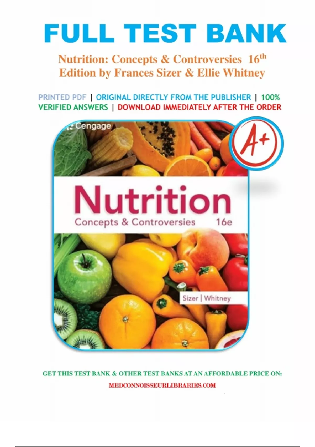 Test Bank for Nutrition: Concepts and Controversies, 16th Edition by Sizer. Full Chapters Include;.....1. An Overview of Nutrition. Highlight 1: Nutrition Information and Misinformation. 2. Planning a Healthy Diet. Highlight 2: Plant-Based Diets. 3. Digestion, Absorption and Transport. Highlight 3: Common Digestive Problems. 4. The Carbohydrates: Sugars, Starches and Fibers. Highlight 4: Carbs, kCalories and Controversies. 5. The Lipids: Triglycerides, Phospholipids and Sterols. Highlight 5: High-Fat Foods -- Friend or Foe? 6. Protein: Amino Acids. Highlight 6: Nutritional Genomics. 7. Energy Metabolism. Highlight 7: Alcohol in the Body. 8. Energy Balance and Body Composition. Highlight 8: Eating Disorders. 9. Weight Management: Overweight, Obesity and Underweight. Highlight 9: The Latest and Greatest Weight-Loss Diet -- Again. 10. The Water-Soluble Vitamins: B Vitamins and Vitamin C. Highlight 10: Vitamin and Mineral Supplements. 11. The Fat-Soluble Vitamins, A, D, E and K. Highlight 11: Antioxidant Nutrients in Disease Prevention. 12. Water and the Major Minerals. Highlight 12: Osteoporosis and Calcium. 13. The Trace Minerals. Highlight 13: Phytochemicals and Functional Foods. 14. Fitness: Physical Activity, Nutrients and Body Adaptations. Highlight 14: Supplements as Ergogenic Aids. 15. Life Cycle Nutrition: Pregnancy and Lactation. Highlight 15: Fetal Alcohol Syndrome. 16. Life Cycle Nutrition: Infancy, Childhood and Adolescence. Highlight 16: Childhood Obesity and the Early Development of Chronic Diseases. 17. Life Cycle Nutrition: Adulthood and the Later Years. Highlight 17: Nutrient-Drug Interactions. 18. Diet and Health. Highlight 18: Complementary and Alternative Medicine. 19. Consumer Concerns About Foods and Water. Highlight 19: Food Biotechnology. 20. Hunger and the Global Environment. Highlight 20: Environmentally Friendly Food Choices.