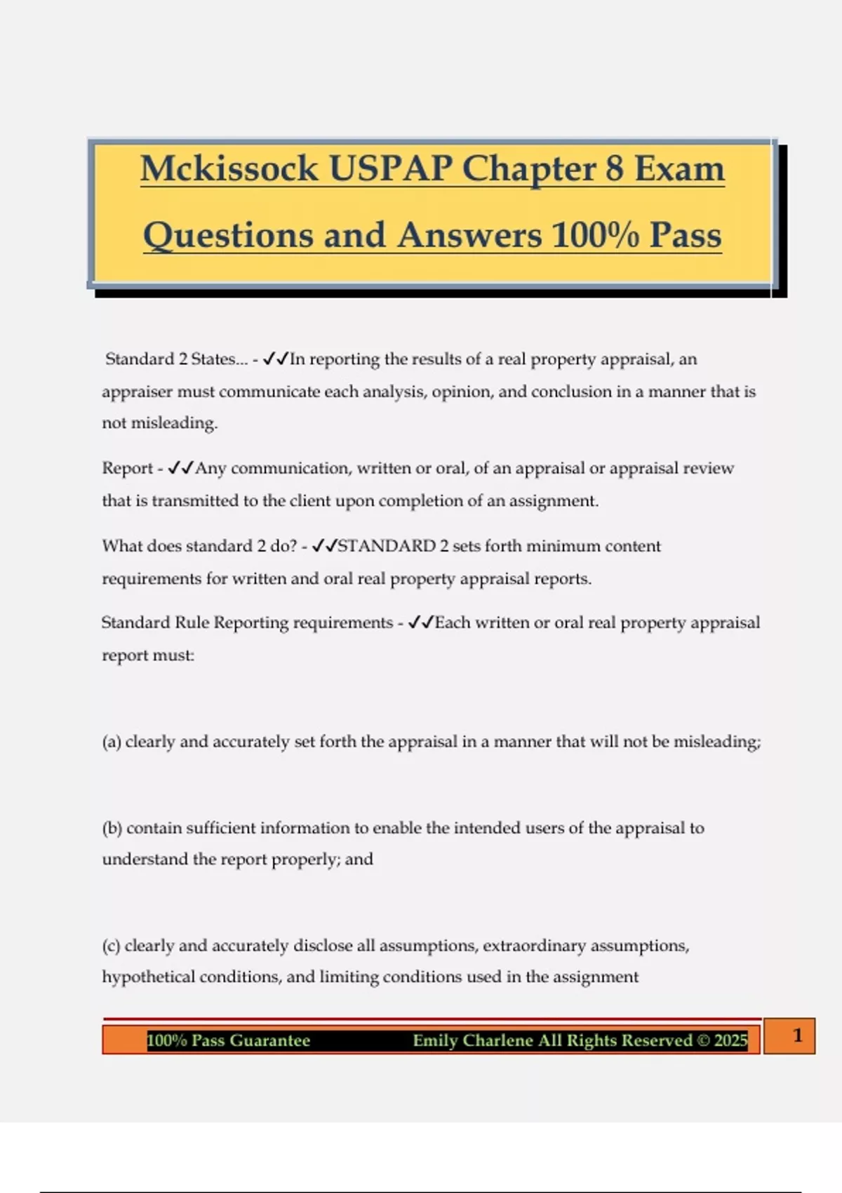 Mckissock USPAP Chapter 8 Exam Questions and Answers 100% Pass Standard 2 States... - In reporting the results of a real property appraisal, an appraiser must communicate each analysis, opinion, and conclusion in a manner that is not misleading. Report - Any communication, written or oral, of an appraisal or appraisal review that is transmitted to the client upon completion of an assignment. What does standard 2 do? - STANDARD 2 sets forth minimum content requirements for written and oral real property appraisal reports. Standard Rule Reporting requirements - Each written or oral real property appraisal report must: (a) clearly and accurately set forth the appraisal in a manner that will not be misleading; (b) contain sufficient information to enable the intended users of the appraisal to understand the report properly; and (c) clearly and accurately disclose all assumptions, extra