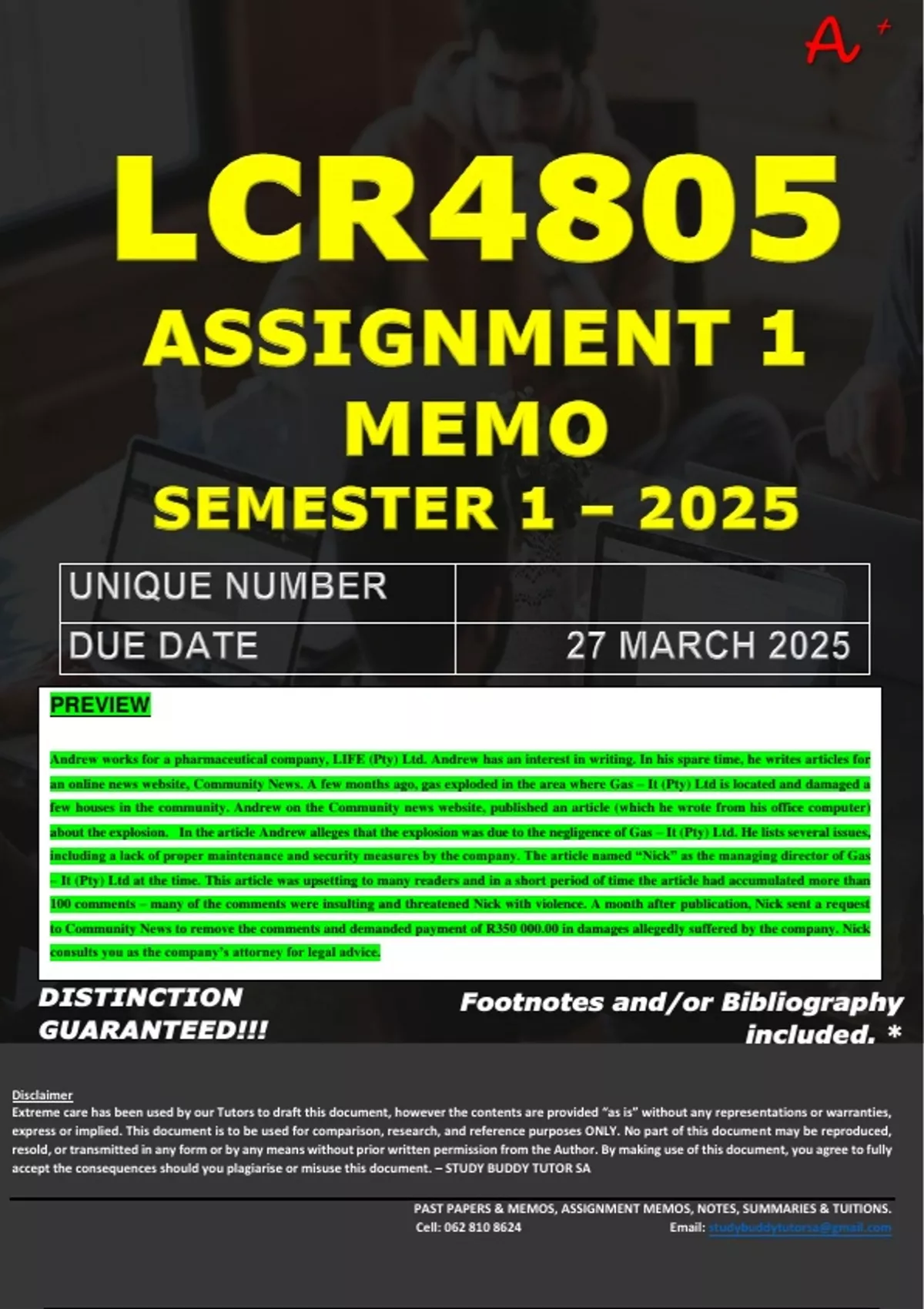 LCR4805 ASSIGNMENT 1 MEMO - SEMESTER 1 - 2025 - UNISA – DUE DATE: - 27 MARCH 2025 (DETAILED ANSWERS - FULLY REFERENCED - GUARANTEED A+!) Question 1 Andrew works for a pharmaceutical company, LIFE (Pty) Ltd. Andrew has an interest in writing. In his spare time, he writes articles for an online news website, Community News. A few months ago, gas exploded in the area where Gas – It (Pty) Ltd is located and damaged a few houses in the community. Andrew on the Community news website, published an article (which he wrote from his office computer) about the explosion. In the article Andrew alleges that the explosion was due to the negligence of Gas – It (Pty) Ltd. He lists several issues, including a lack of proper maintenance and security measures by the company. The article named “Nick” as the managing director of Gas – It (Pty) Ltd at the time. This article was upsetting to many readers and in a short period of time the article had accumulated more than 100 comments – many of the comments were insulting and threatened Nick with violence. A month after publication, Nick sent a request to Community News to remove the comments and demanded payment of R350 000.00 in damages allegedly suffered by the company. Nick consults you as the company’s attorney for legal advice. Can Andrew ’s employer, LIFE Pty Ltd, be held vicariously liable for Andrew’s conduct, since Andrew wrote the alleged defamatory article on his office computer? In your answer refer to applicable law. (10) Assessment criteria • This question will be evaluated primarily on the overall content of the answer, the substantiated conclusions and the referencing style used. You will be penalised if you merely “copy and paste” information from the Internet. You have to communicate the information in your own words. • Length restriction: Your answer to this question may not exceed 2 typed pages. Question 2 During the recruitment of new staff, an employer checks the profiles of the candidates on various social networks and includes information from these networks in the screening process. The employer has not informed the candidates about this. (a) Does the Protection of Personal Information Act 4 of 2013 allow an employer to include information of candidates found on social networks when screening candidates? Discuss. (10) (b) Does the use of information found in a candidate’s inbox on a social network amount to an interception of a communication as defined in the Regulation of Interception of Communications and Provision of Communication-related Information Act 70 of 2002? Discuss. (10) Assessment criteria • This question will be evaluated primarily on the overall content of the answer, the substantiated conclusions and the referencing style used. You will be penalised if you merely “copy and paste” information from the Internet. You have to communicate the information in your own words. • Length restriction: Your answer to this question may not exceed 3 typed pages. More but related content can be acceptable. TOTAL: [30]