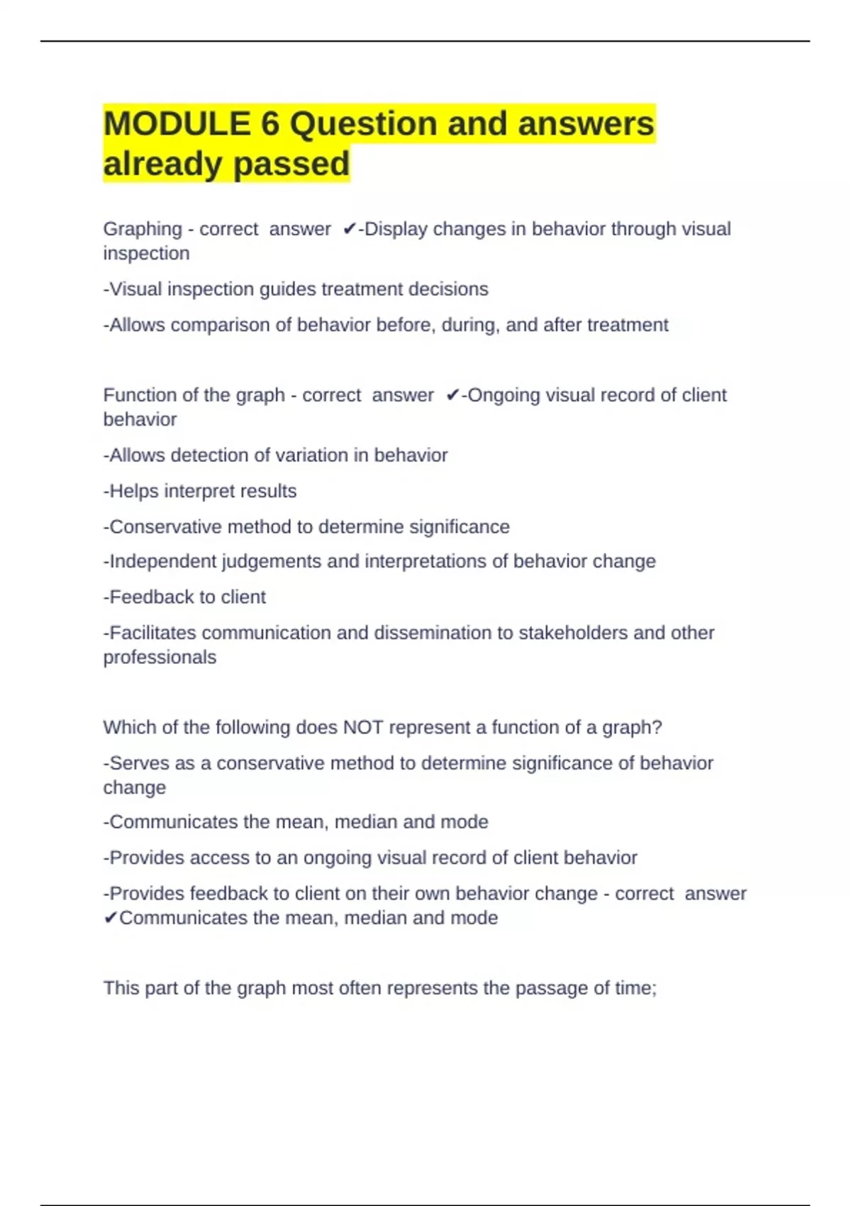 MODULE 6 Question and answers already passed Graphing - correct answer -Display changes in behavior through visual inspection -Visual inspection guides treatment decisions -Allows comparison of behavior before, during, and after treatment Function of the graph - correct answer -Ongoing visual record of client behavior -Allows detection of variation in behavior -Helps interpret results -Conservative method to determine significance -Independent judgements and interpretations of behavior change -Feedback to client -Facilitates communication and dissemination to stakeholders and other professionals Which of the following does NOT represent a function of a graph? -Serves as a conservative method to determine significance of behavior change -Communic