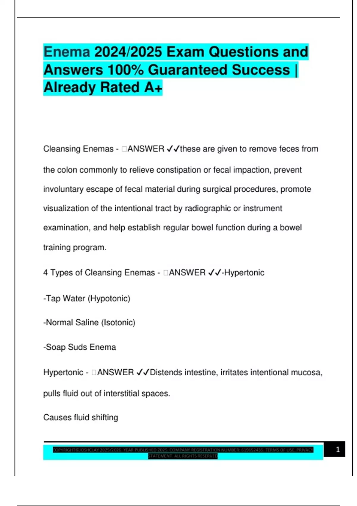 Enema 2024/2025 Exam Questions and Answers 100% Guaranteed Success | Already Rated A+ Cleansing Enemas -